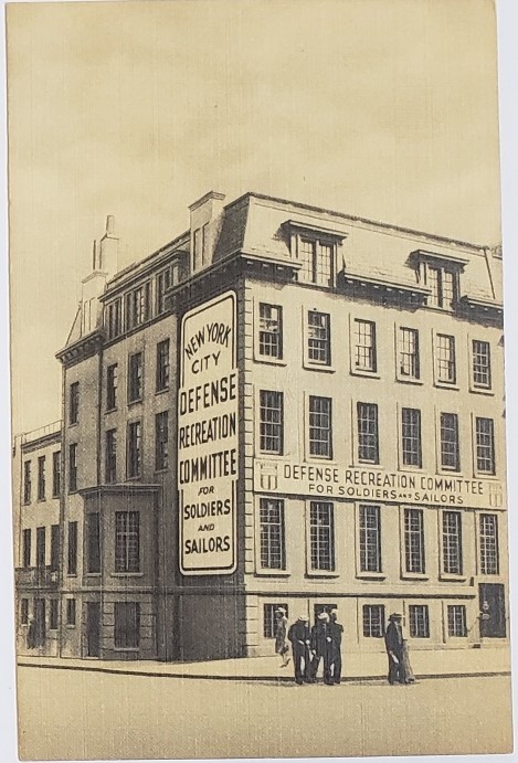 Black White picture of the New York City Defense Recreation Committee for Soldiers and Sailers Building. Where New York City Greets Its Service Men Visitors.