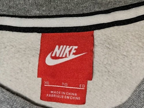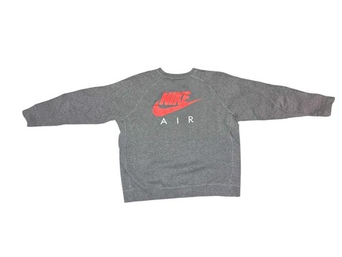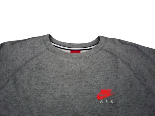 This Nike Air Crew Sweatshirt is designed for men in size XL. It features a solid gray color with bright crimson accents and a classic crew neckline. Made from a blend of polyester and cotton fleece, this pullover sweatshirt is lightweight and breathable, suitable for winter, fall, and spring seasons. The Nike Air logo adds a sporty touch to the overall colorful and classic design, making it ideal for activities like gym training, walking, and running.