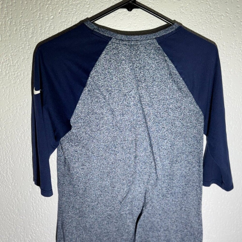 Represent your favorite NFL team in style with this authentic Nike Dallas Cowboys women's tee. This comfortable raglan-style shirt features contrasting navy 3/4 sleeves and a heathered blue-gray body, boldly displaying "COWBOYS" across the front. The Nike swoosh adorns the sleeve, complemented by subtle team branding near the hem. Lightweight, stretchy fabric offers all-day comfort, making it perfect for game days or casual wear.