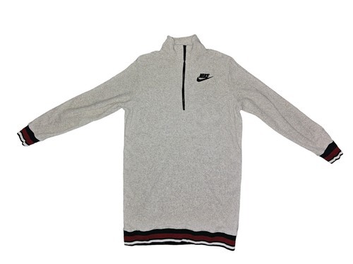 Elevate your comfort and style with this Nike French Terry Half Zip Dress in a light gray color. The dress features a mock neck and long sleeves with ribbed and striped details on the cuffs and hem. It also comes with a convenient zip closure and an embroidered Nike logo accent.