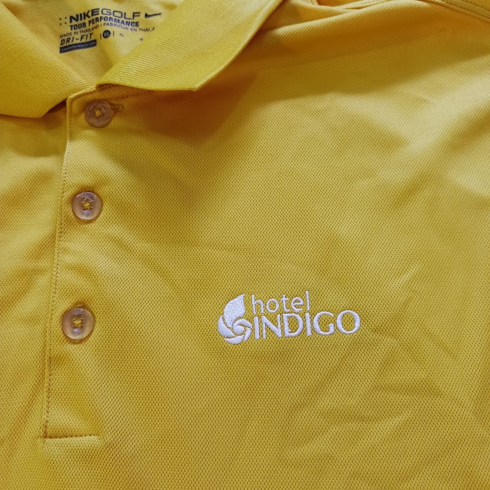 - Nike Golf Dri-Fit Hotel Indigo Print Logo Mens Polo Yellow Shirt Short Sleeve XL