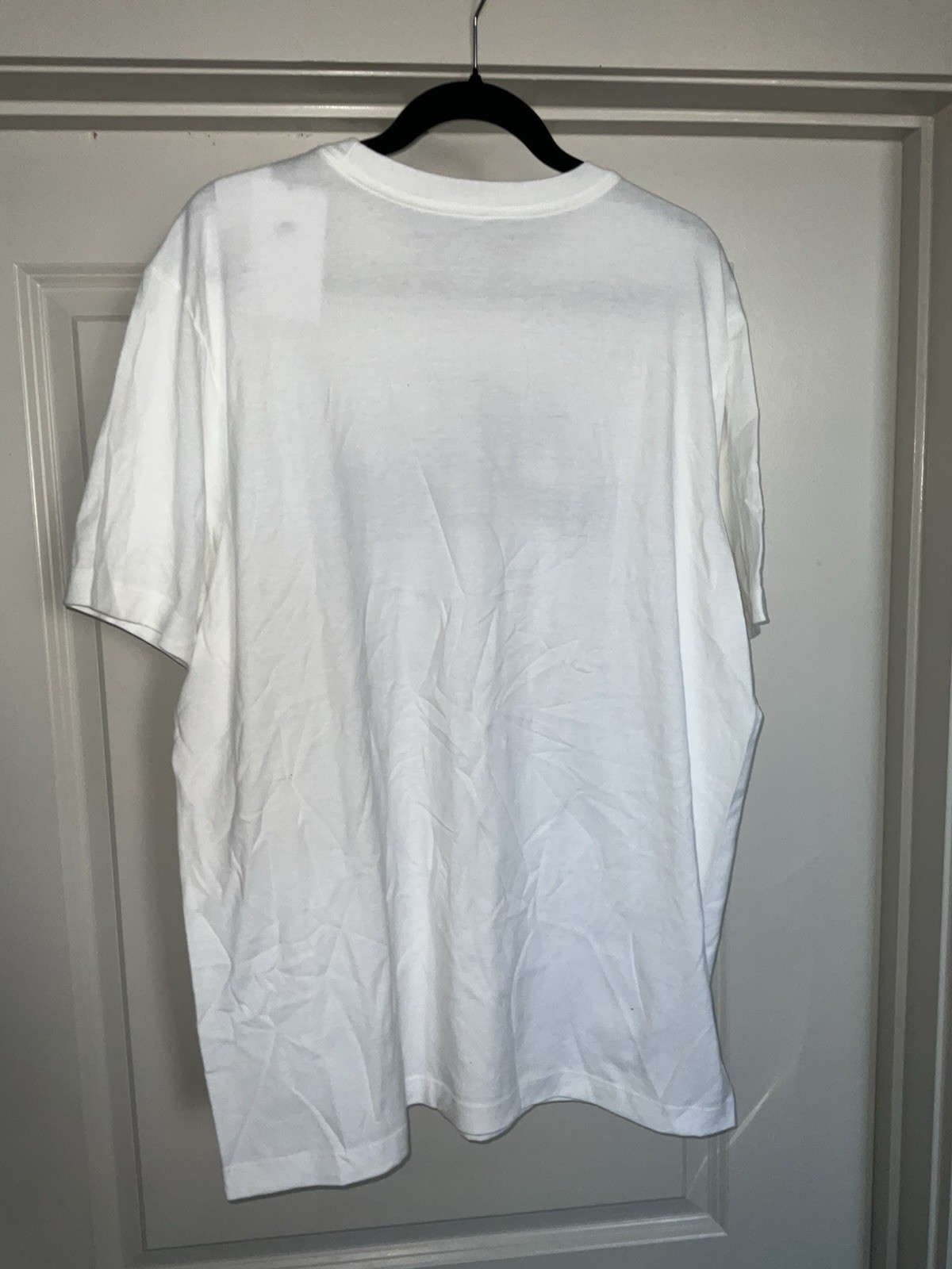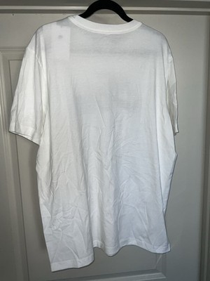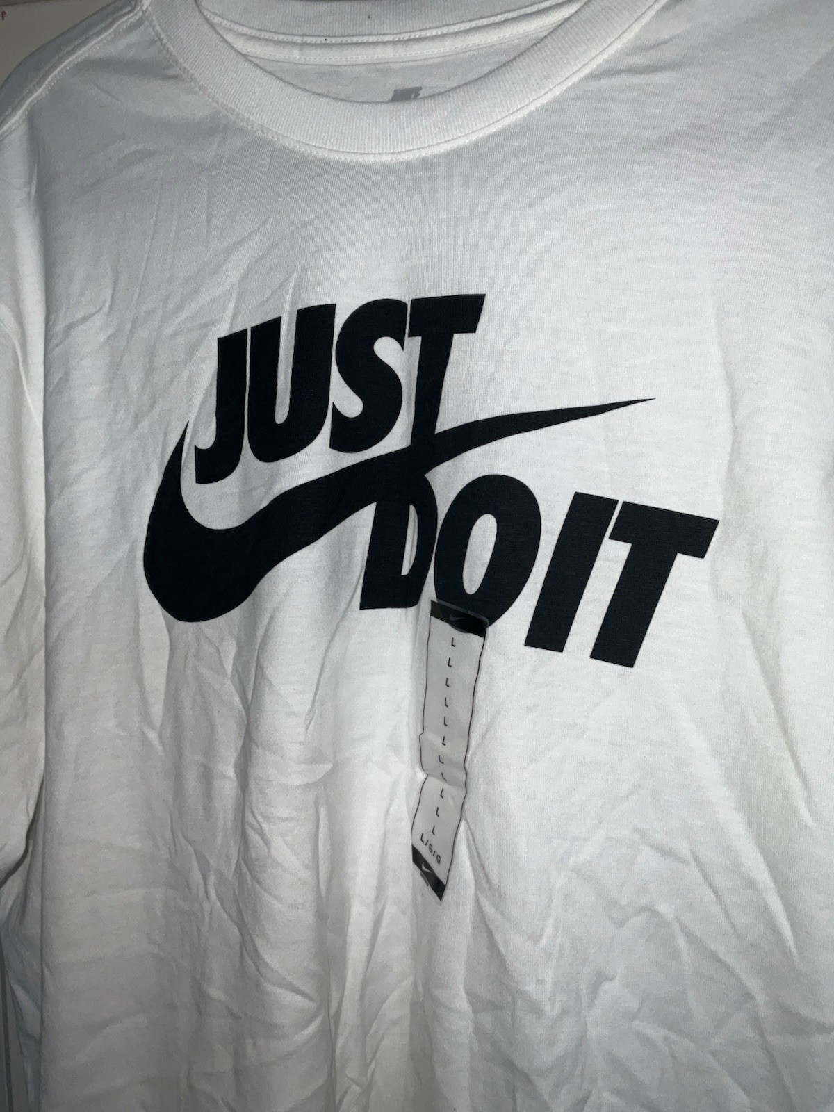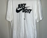 The Nike Just Do It Men's T-Shirt in White, size Large, is a classic piece made from comfortable cotton knit fabric. With a Crew Neck and Short Sleeves, this shirt is perfect for everyday wear or as part of a sports-themed outfit. The shirt features the iconic Nike branding and has a solid pattern, making it a versatile option for any man's wardrobe.