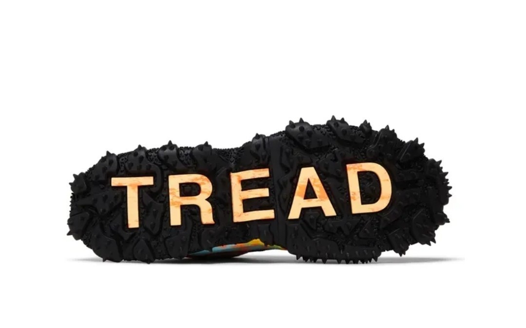 The Off-White x Nike Air Terra Forma ?Mantra Orange? delivers a translucent Swoosh on a suede upper, featuring a black base with contrasting rust-colored overlays. A marbled blend of pastel hues enlivens the heel counter and a molded, cored-out tongue, tucked beneath a zip-up ripstop shroud. Off-White branding is printed on the medial side, while graffiti-style graphics wrap around the heel. Visible Air-sole cushioning is nestled in the heel of the marbled midsole, which is partially wrapped up by a spiked black rubber outsole.
