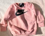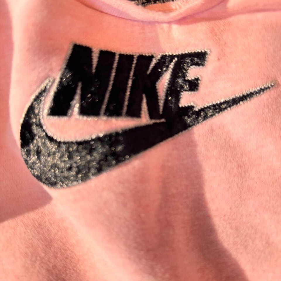 Adorable pink Nike baby sweatshirt in size 9M (68?74 cm). Features a soft, cozy fleece material with a black velvet-textured Nike logo across the chest. Long sleeves with ribbed cuffs and an elastic waistband for a snug fit. Perfect for layering in cooler weather!
