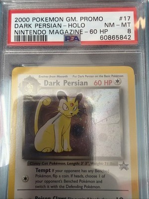 The Nintendo Magazine Black Star Promo Set Holo PSA 8 2000 Dark Persian #17 is a vintage Pokemon card from the 2000 Pokemon Game Promo set. This Colorless Pokemon card features the Dark Persian character with 60 HP, illustrated by Ken Sugimori. As a Stage 1 Pokemon card with a Holo finish, it holds value for collectors and fans of the Pokemon Trading Card Game. This rare and sought-after card was manufactured by Nintendo and printed on standard card stock in the United States, making it a desirable addition to any Pokemon card collection.