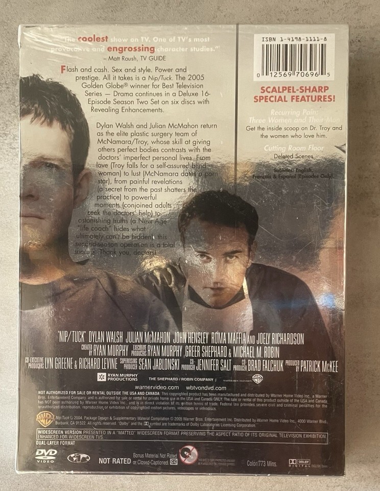 Nip/Tuck ? The Complete Second Season (2005) DVD 6-disc box set. The award-winning FX medical drama follows plastic surgeons Sean McNamara and Christian Troy. Includes all Season 2 episodes plus bonus features.