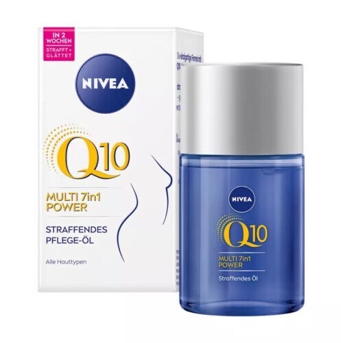 NIVEA Q10 MULTI POWER 7in1 Firming + Even Oil: The well known formula with Q10 has been enriched with macadamia oil, avocado cotton seed oil. This unique formula firms and evens skin tone- plus it spreads easily and smells great. Our best multitasker firms skin in 2 weeks and reduces the appearance of stretch marks. The skin compatibility has been dermatologically approved.