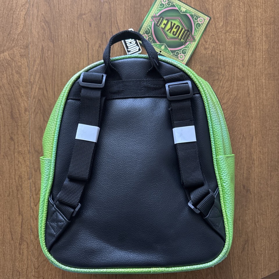 This is a Wicked brand mini backpack purse for women, featuring a stylish green exterior made of polyurethane. It has a strap drop of 10.5 inches and is designed with a unique Elphaba theme, inspired by the character from Wicked.
