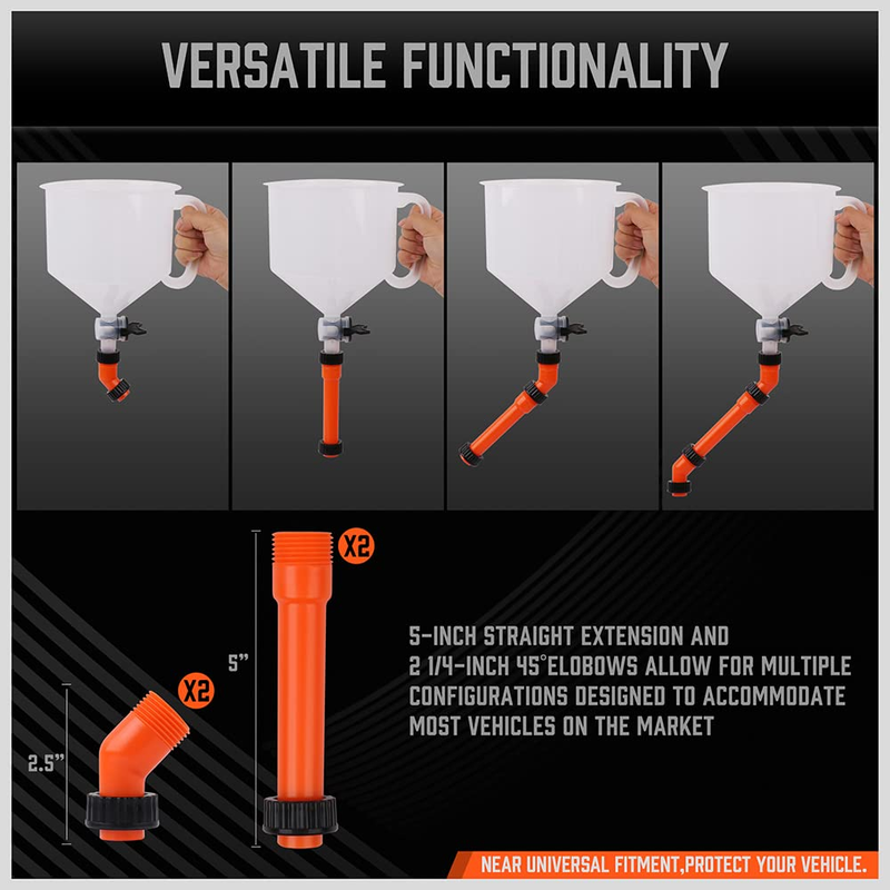 The multipurpose funnel kit contains 5 Adapters, 4 Filler Caps, Two 45 elbows, Two 5? extender and a thick transparent antifreeze funnel .