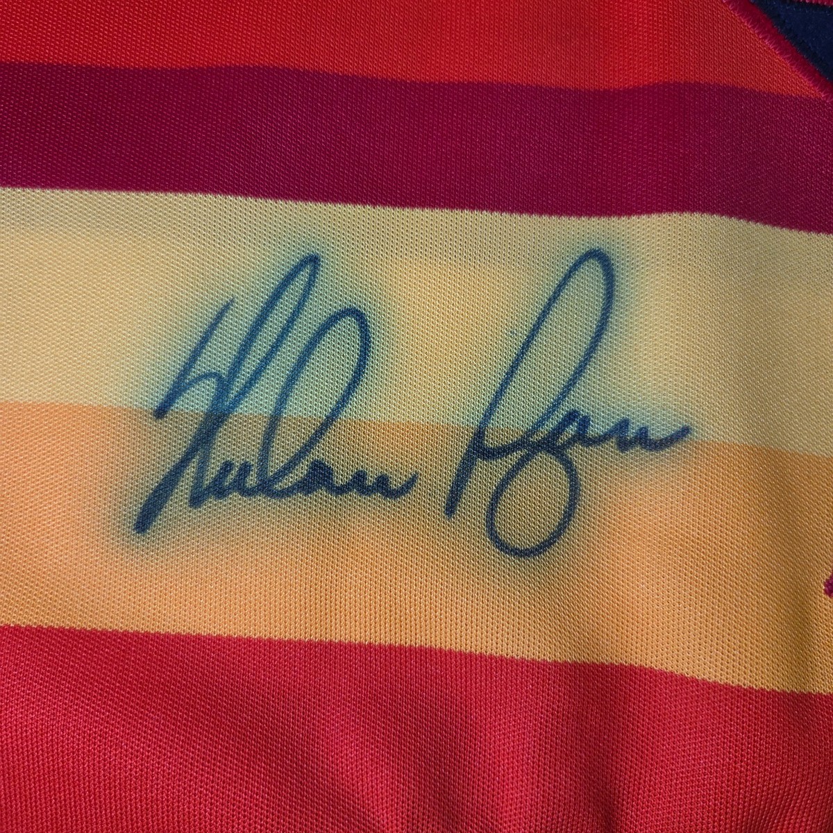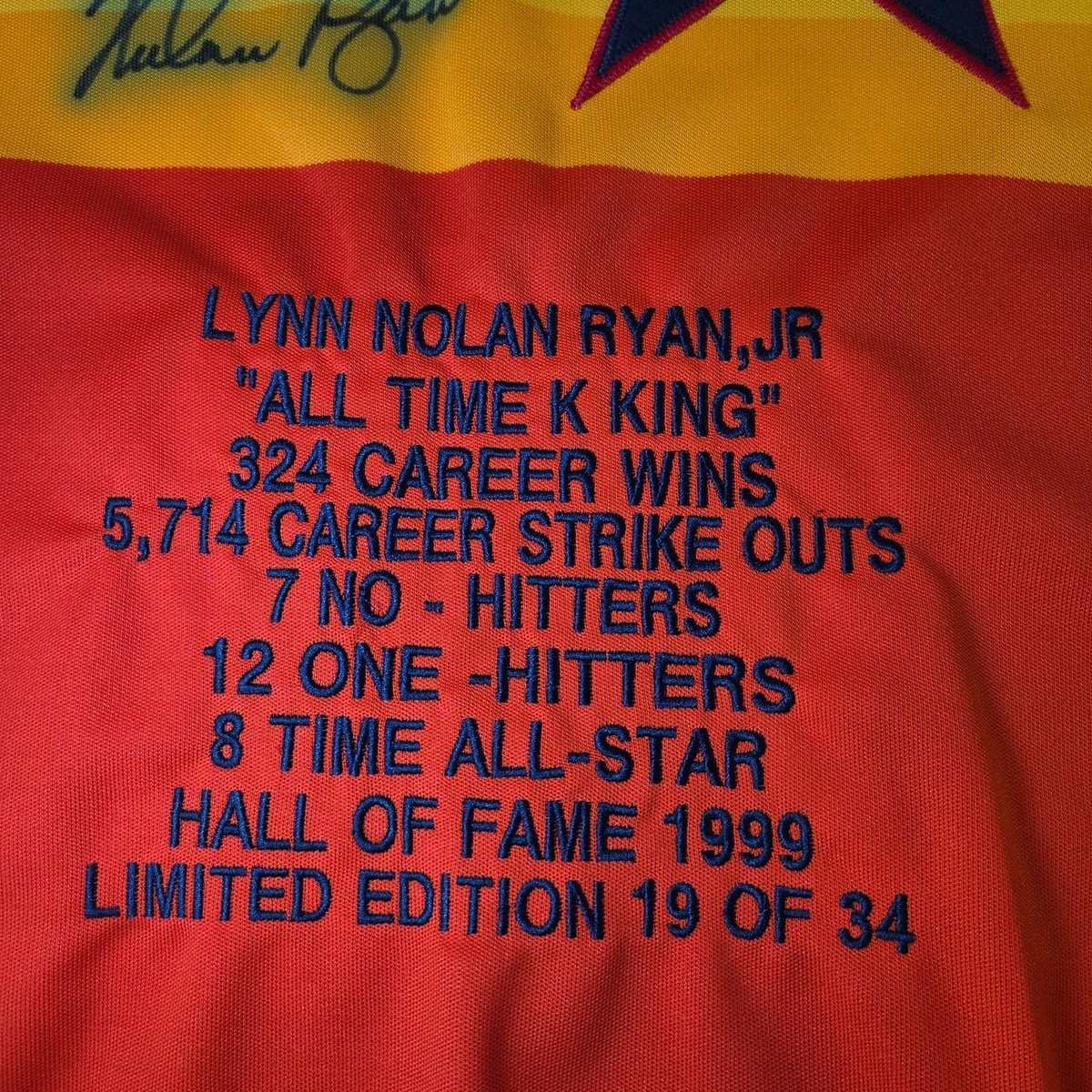 Own a piece of baseball history with this rare and highly collectible Nolan Ryan autographed jersey. This Houston Astros stat jersey is part of a limited edition run of just 34 pieces, commemorating Ryan?s iconic number 34. It is brand new with tags and features detailed career stats on the back, including milestones like 7 No-Hitters and 5,714 Strikeouts.