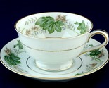Noritake Daphne fine china cup and saucer, pattern number 5312, with green leaves, light tan flowers on white and gold trim. This pattern was produced from 1952 to 1960. The saucer is 5-3/4 inches in diameter. The footed cup is 4 inches in diameter at the top and 2-1/4 inches tall. This china was previously owned but never used and is in like new condition.