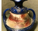 Noritake Hand Painted Landscape Cobalt Blue Gold Gilded 3-Footed Vase Signed With 5 Petal Flower On Bottom
