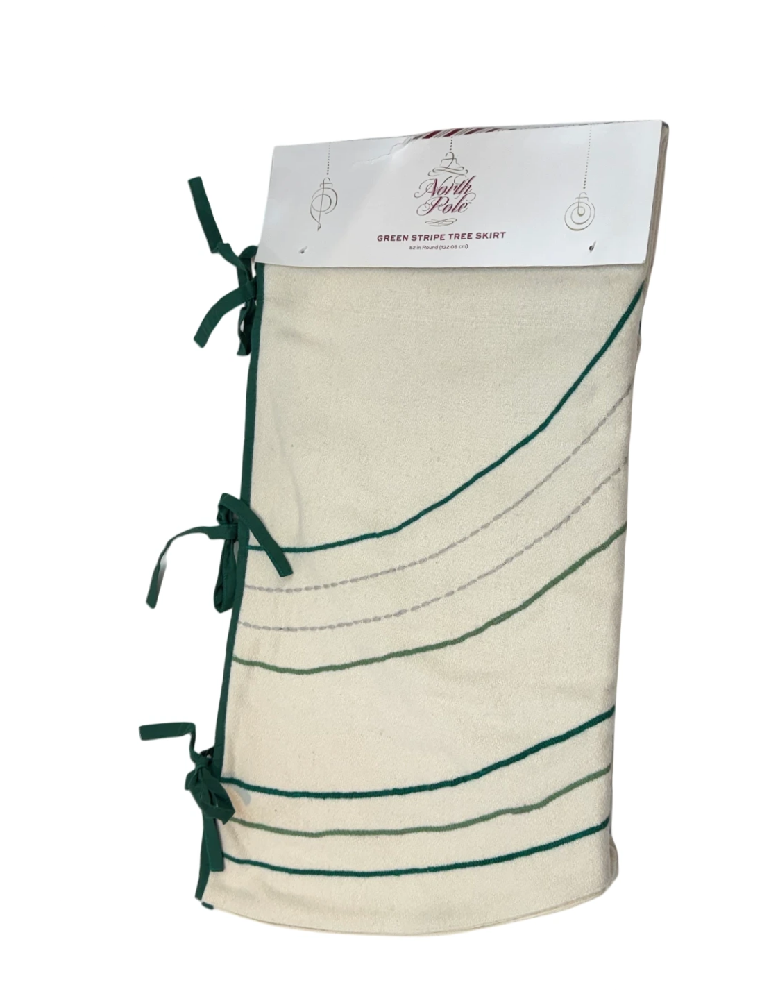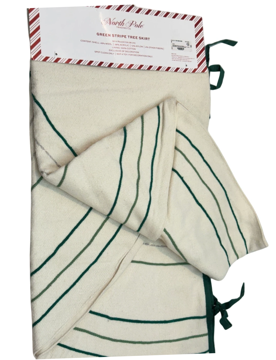 - North Pole Trading Wool Christmas Tree Skirt Cream Green Stripe 52" x 52" Round