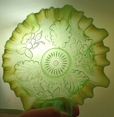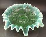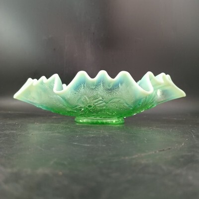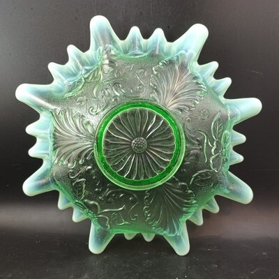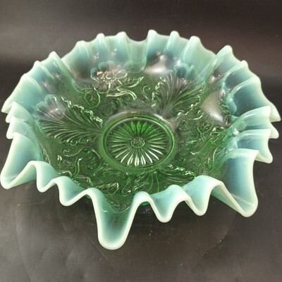 - Northwood Leaf & Blossom Ruffled Edge Glass Bowl, Opalescent Green 9" c.1906 OBO