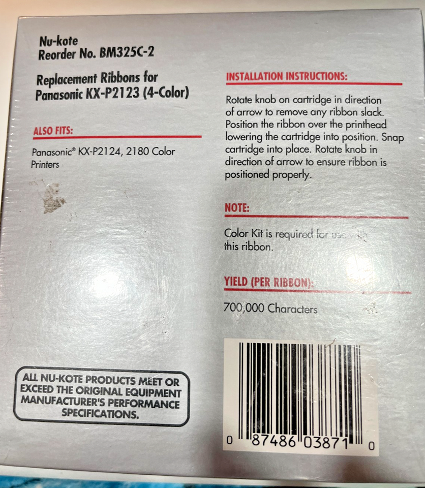 - Nukote BM 325C-2 Panasonic KX-P 2123 4 color nylon ribbon