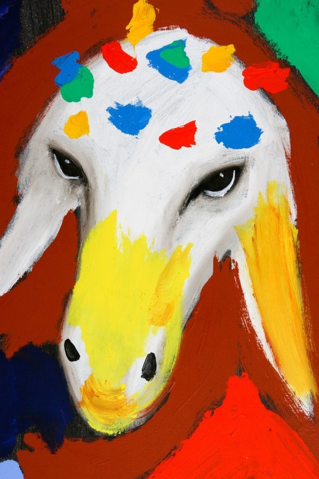 Menashe Kadishman (Hebrew: ???? ???????; born 1932, Tel Aviv) is an Israeli sculptor and painter. In his youth, between 1950 and 1953, Kadishman worked as a shepherd on Kibbutz Ma'ayan Baruch. This experience with nature, sheep and shepherding had a significant impact on his later artistic work and career. The first major appearance of sheep in his work was in the 1978 Venice Biennale, where Kadishman presented a flock of colored live sheep as living art.[2] In 1995, he began painting portraits of sheep by the hundreds, and even thousands, each one different from the next. These instantly-recognizable sheep portraits soon became his artistic "trademark". (from Wikipedia)