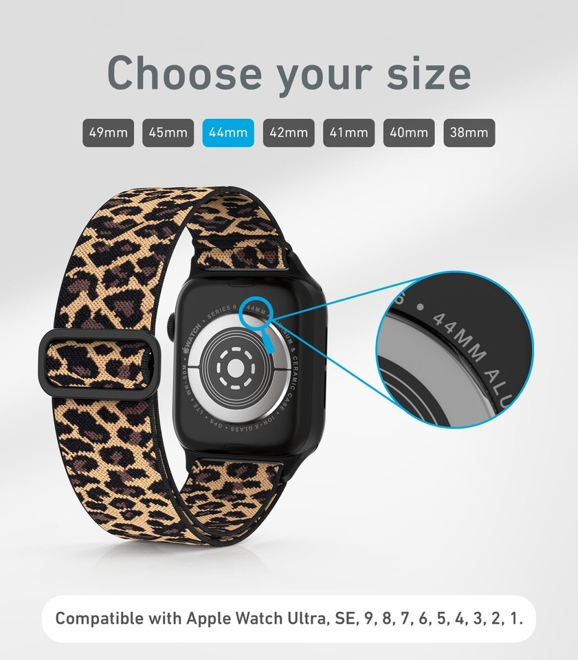 : Models 38mm/40mm/41mm are suitable for a wrist circumference of 5"-7" (12.7-17.7cm), while 42mm/44mm/45mm/49mm bands fit wrist circumferences of 6"-8" (15.2-20.3cm).