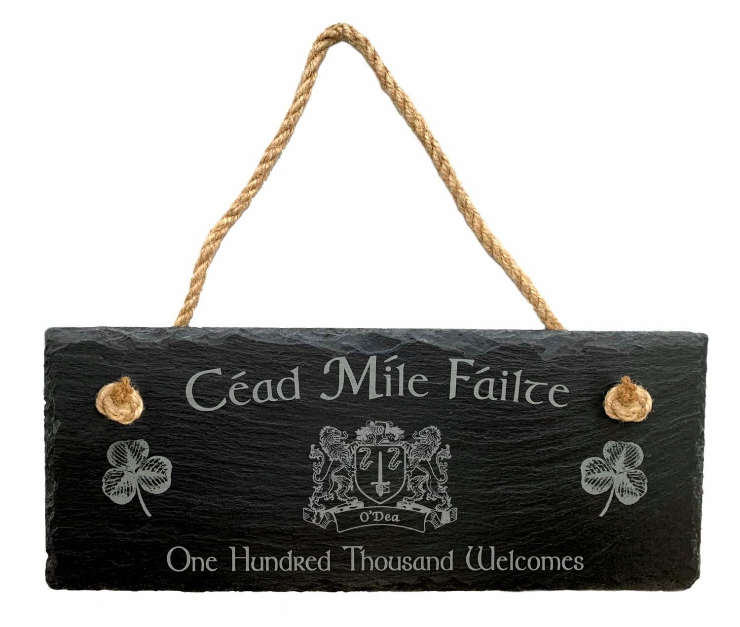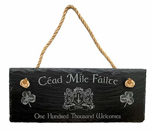 O'Dea Irish Coat of Arms Slate Plaque Blessing - "Cead Míle Failte". Welcome guests into your home with an Irish blessing! Made from one piece of solid slate and expertly laser-etched, each one of our personalized Irish Coat of Arms Slate Plaques come with your very own Irish Coat of Arms and Surname along side the classic Irish blessing: "Cead Mile Failte". Comes with a durable braided rope to be hung anywhere you'd like!