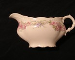 COLORS: White with pink and purple flowers, green leaves band. Raised dotted decoration around scalloped rim.