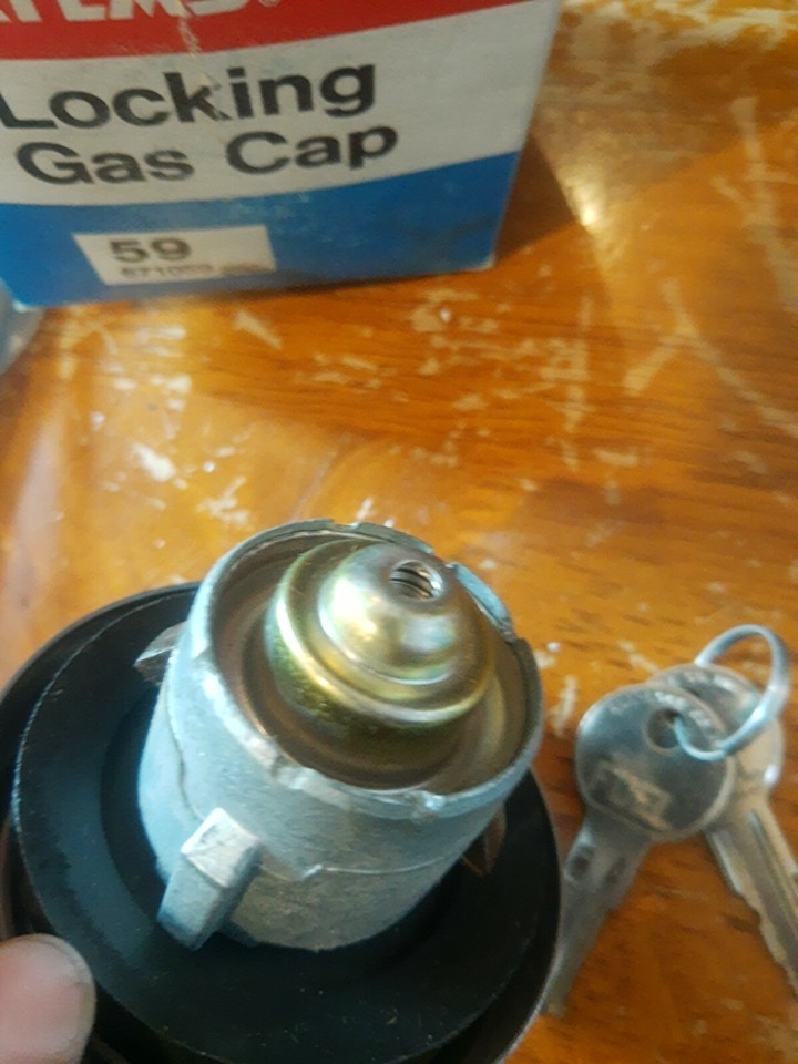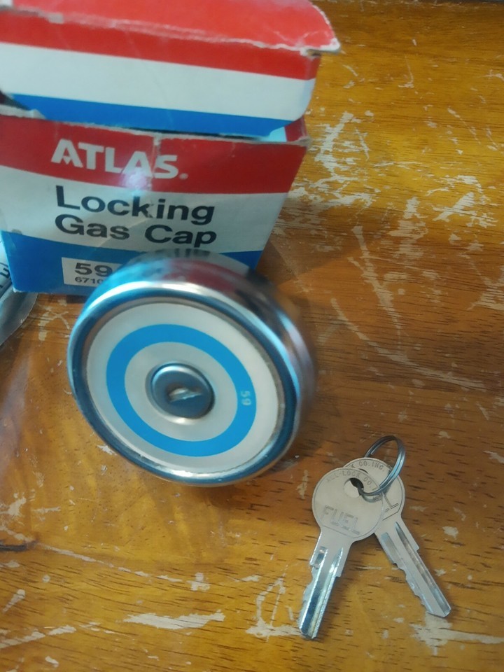 - OEM NOS Vintage Car Atlas Chrome Locking gas cap cover w/ keys blue anello # 59