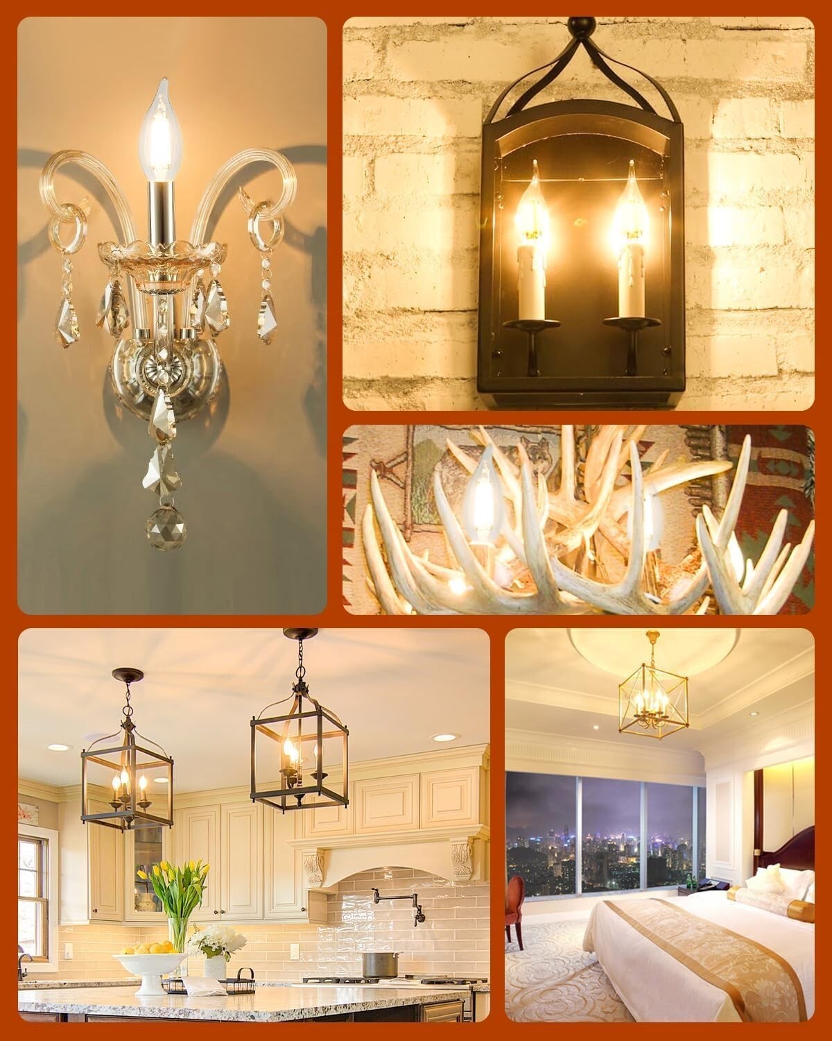 [Widely Used] E12 base candelabra bulb with vintage charming fire tip candle style, suitable for any E12 base light fixture, such as ceiling fans, table lamps, chandeliers, sconces, wall sconces and so on. Widely used in bedroom, living room, dining room, kitchen, bathroom, hallway, entrance, foyer, porch, etc.