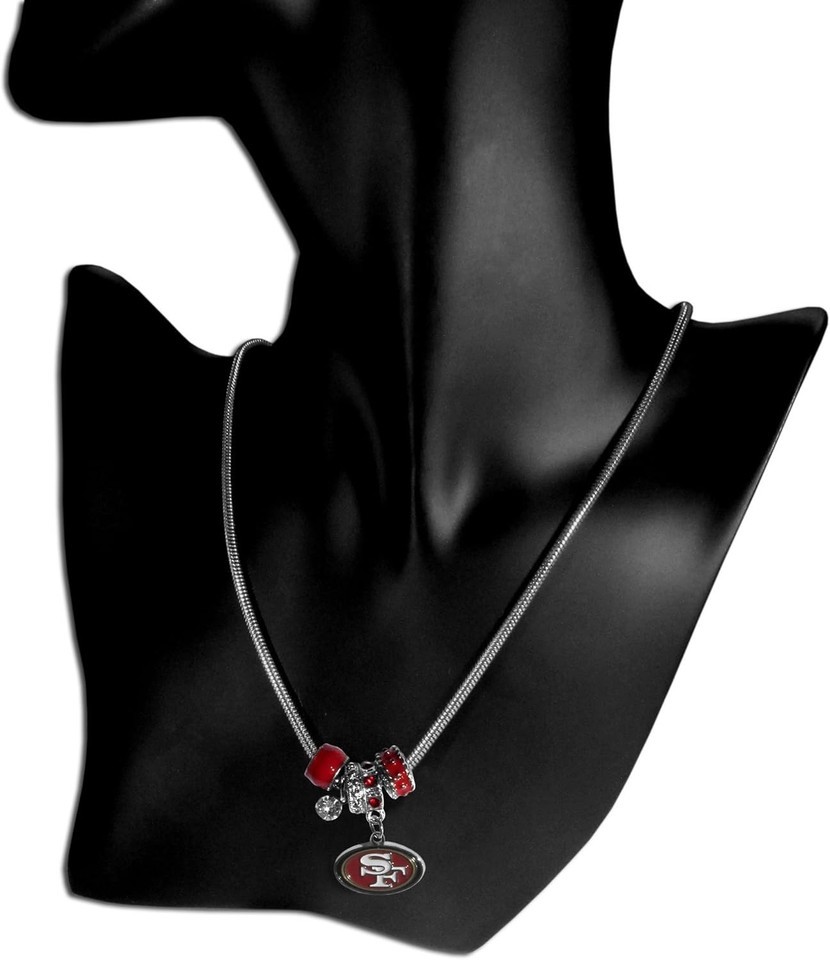 Show your team spirit with this officially licensed NFL necklace featuring the San Francisco 49ers. The 18-inch snake chain is adorned with four team-colored Euro style beads and a sparkling rhinestone charm, highlighting the team's colors in high polish chrome and enamel. Perfect for any fan looking to combine their love of the game with stylish accessories.