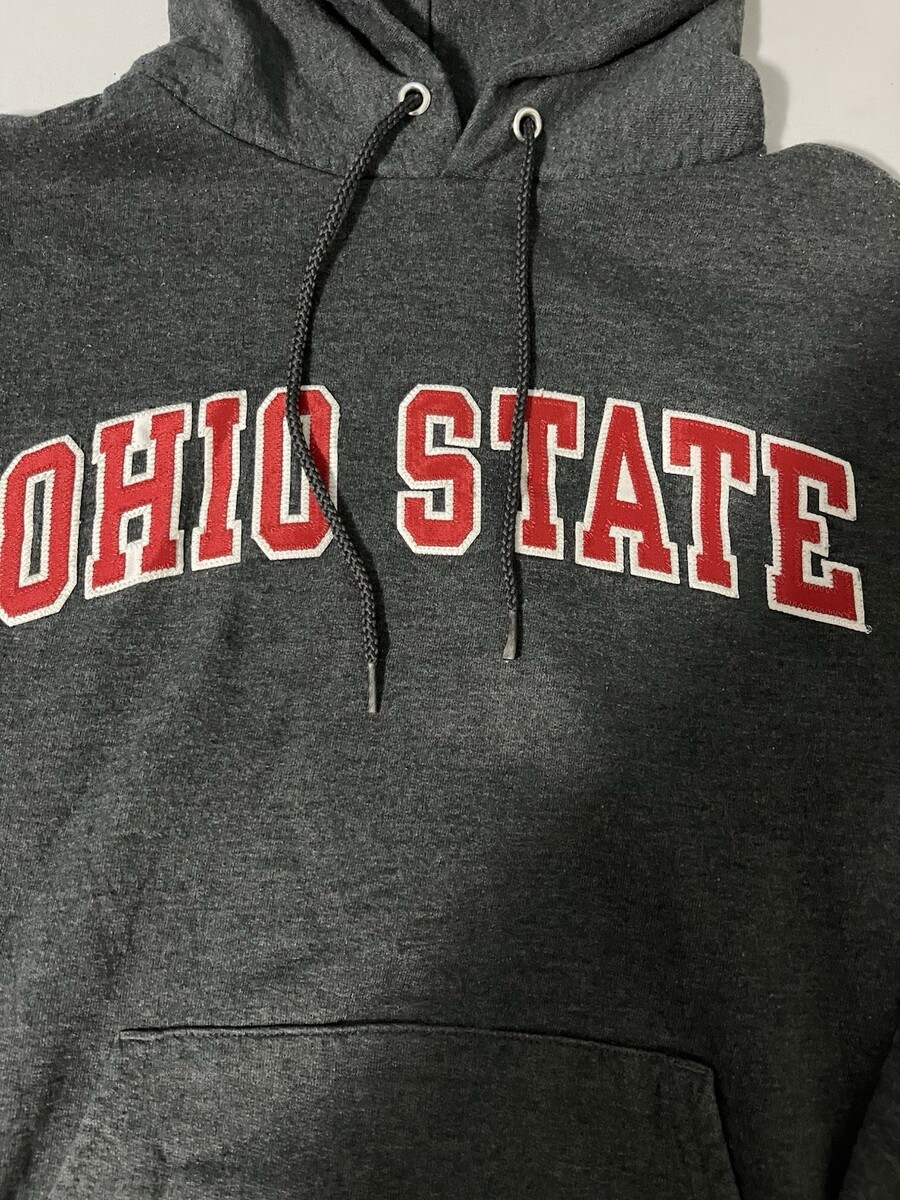 The product is a Champion sweatshirt hoodie in size small featuring embroidered logos of the Ohio State Buckeyes, a NCAA team. The sweatshirt is a stylish and comfortable way for fans to show their support for the team, with the Champion brand ensuring high quality and durability. Perfect for chilly weather or casual wear, this sweatshirt is a must-have for any Ohio State Buckeyes fan looking to add some team spirit to their wardrobe.