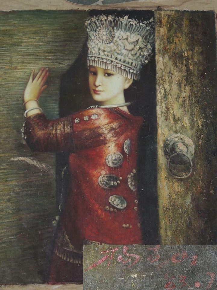 - Oil Painting on Canvas 23.5"x20" woman @ door traditional dress poss Yang Keshan