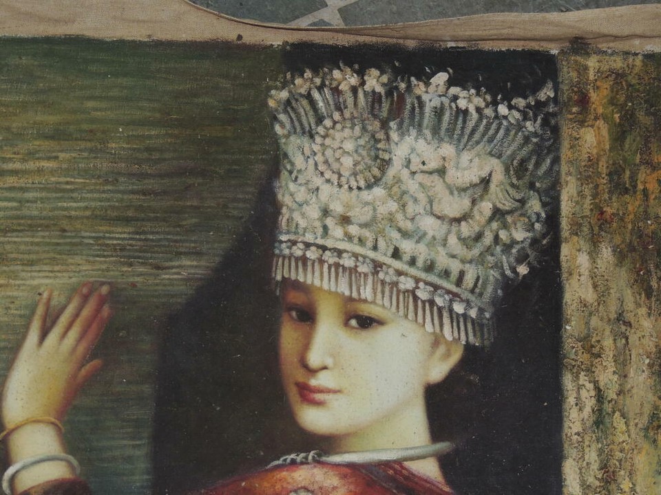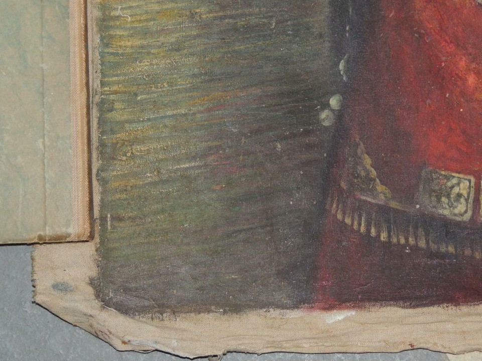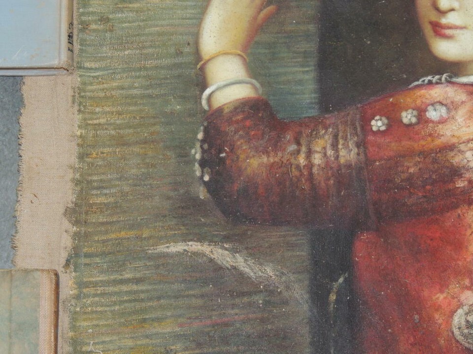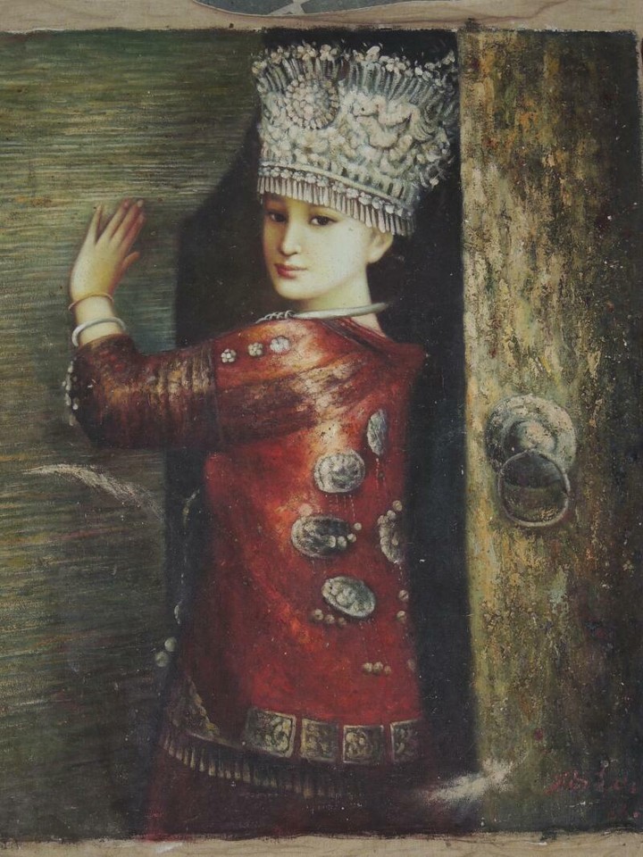 - Oil Painting on Canvas 23.5"x20" woman @ door traditional dress poss Yang Keshan