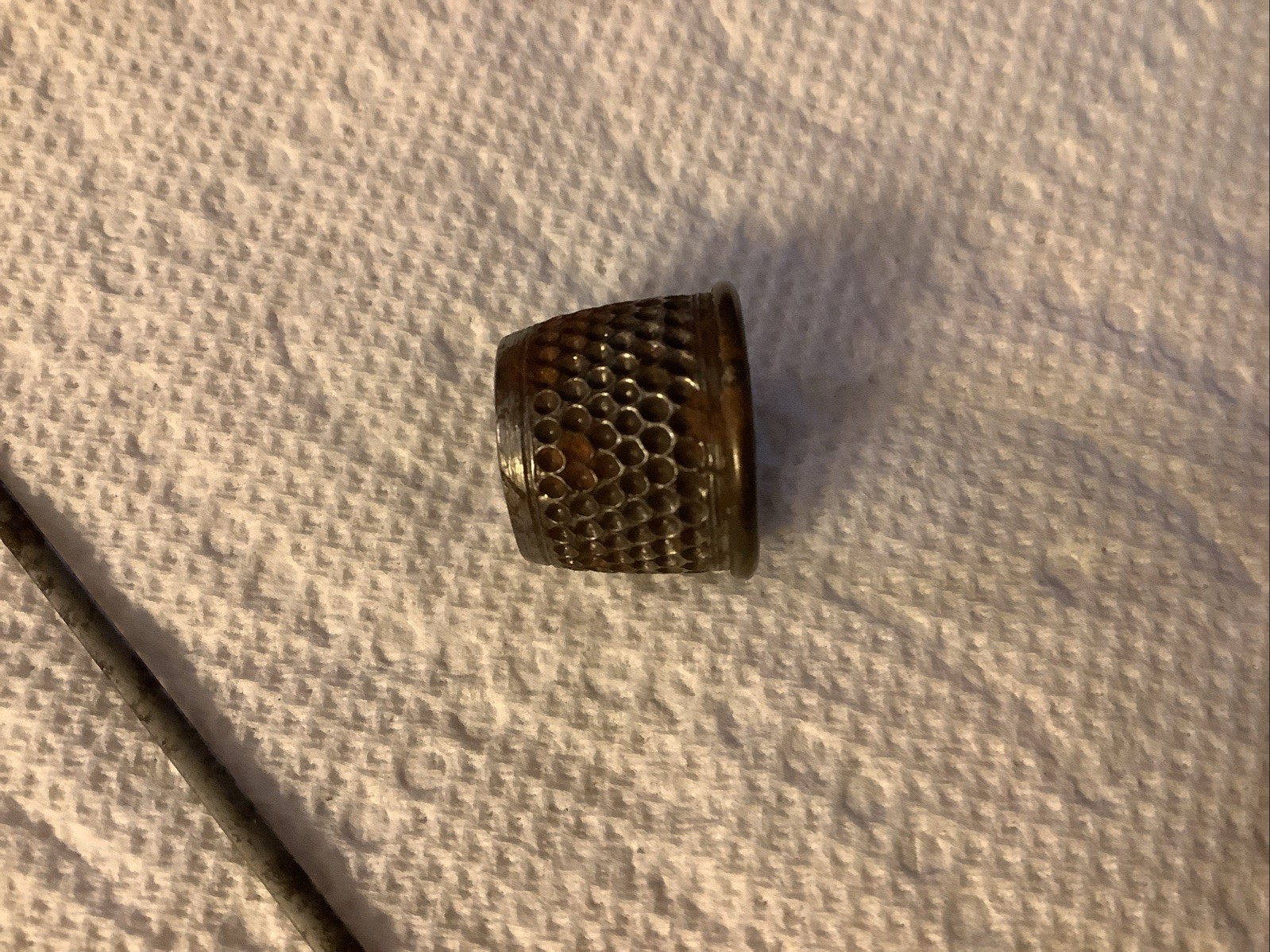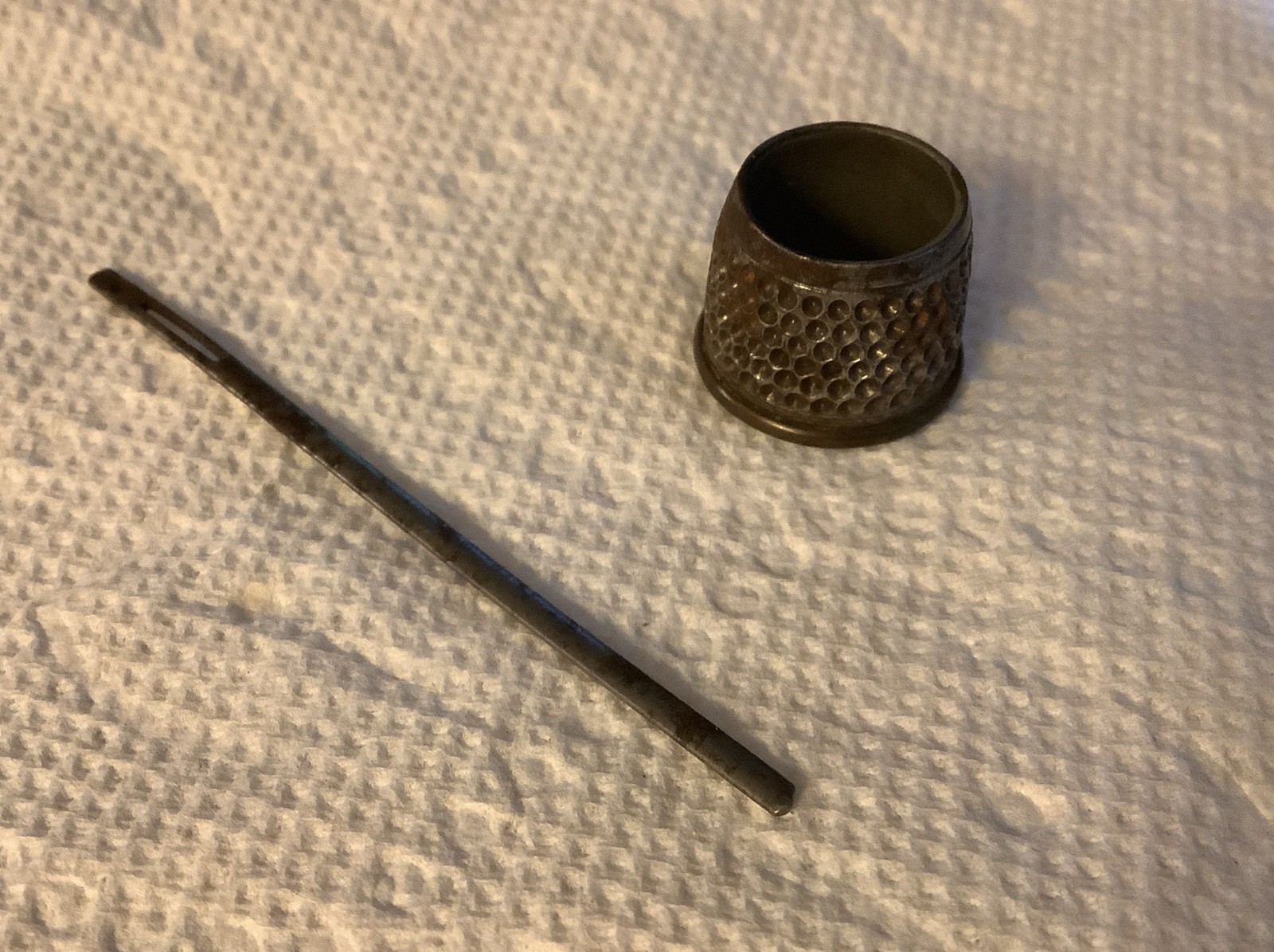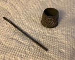 After much contemplation I believe these are tools used to do lacing on leatherwork. Fair condition, both have rust. The needle is flat, 3 inches long and has a long eye and a small round eye. The thimble is open at the top and was used to push the needle through the hole. It fits on my thumb, but I have fairly slim fingers. No markings on either piece. Feel free to email with questions. I do combine shipping on multiple items. Have a great day!