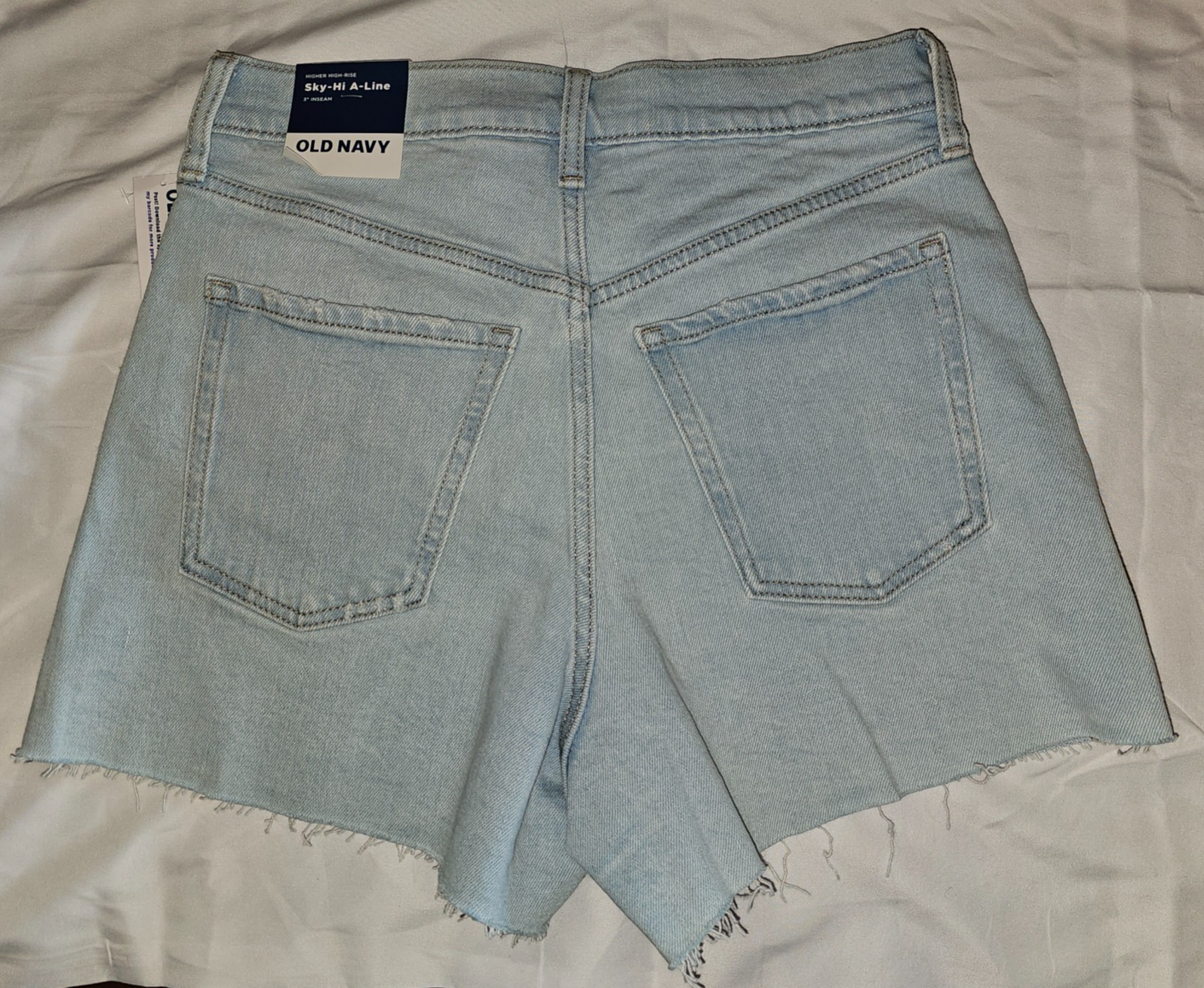 Old Navy Women's Higher High-Rise Sky-Hi-A-Line Denim Shorts. 3 inch inseam. New. Raw Hem. Secret smooth pockets. 99% cotton, 1% spandex.