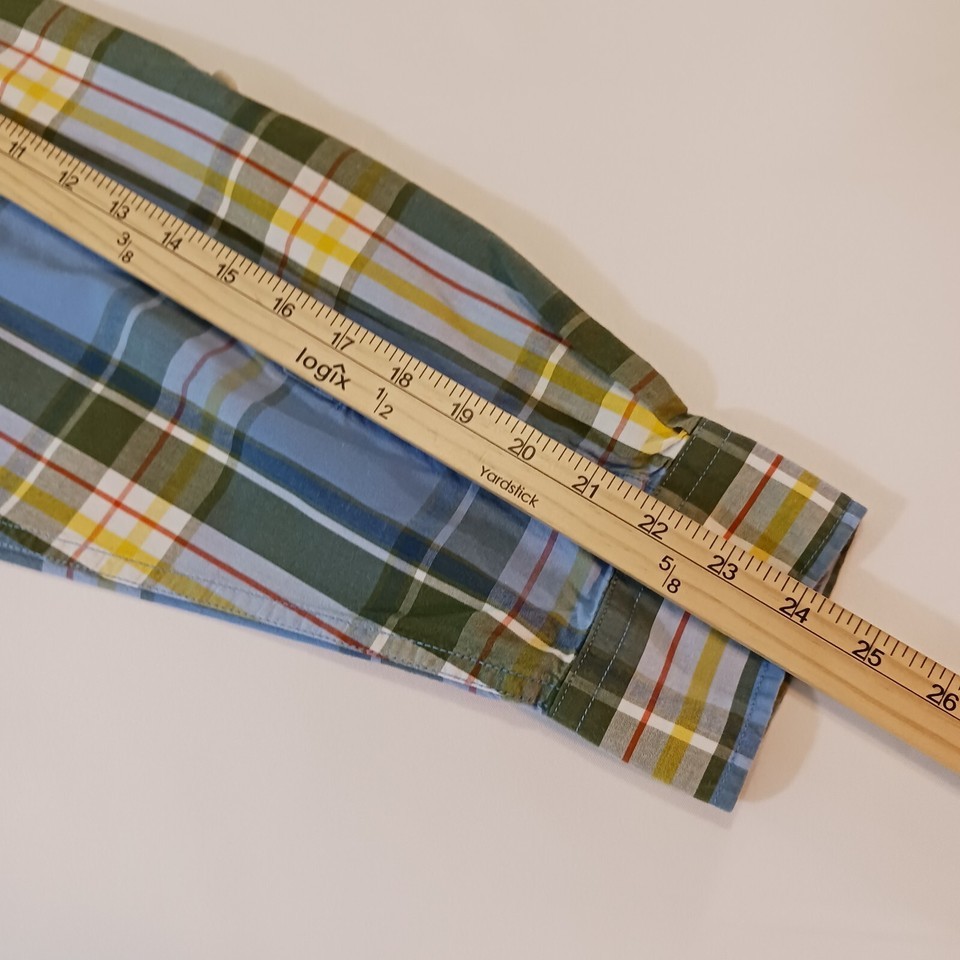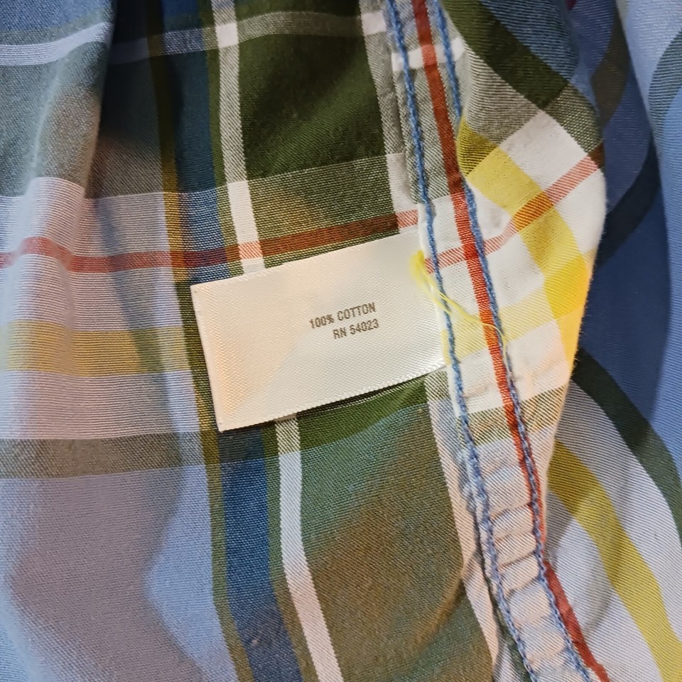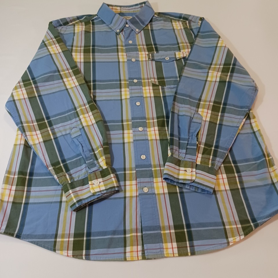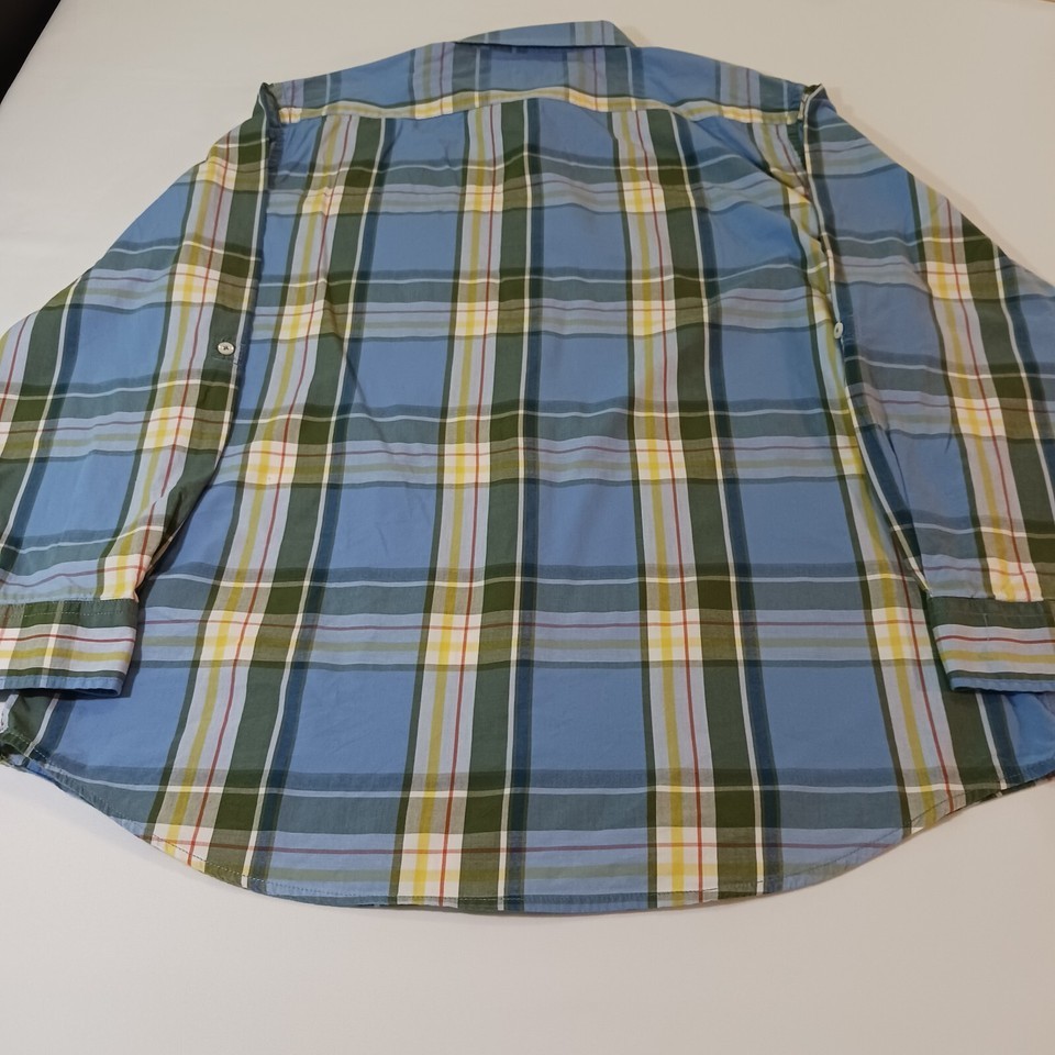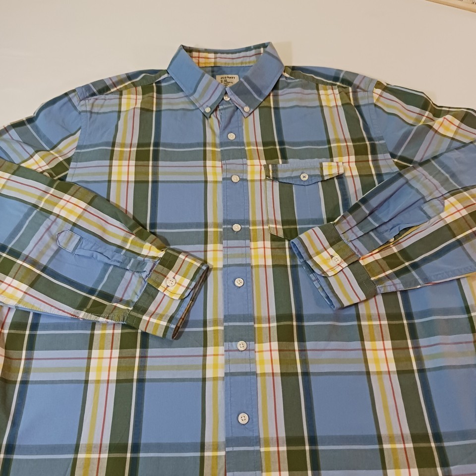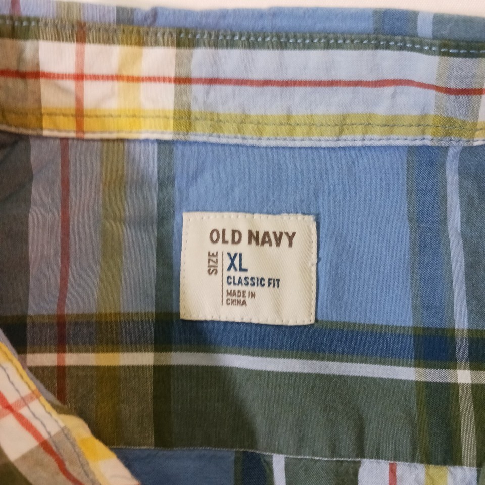 This is a pre-owned Old Navy men's shirt in size XL. It features a plaid pattern in multiple colors, a collared neckline with a button-down style, and long sleeves. The shirt is made of cotton and is machine washable. It has a classic fit and includes slimming features and pockets. This shirt is suitable for travel, parties, casual wear, and business settings. It does not have any graphic prints and was made in China.
