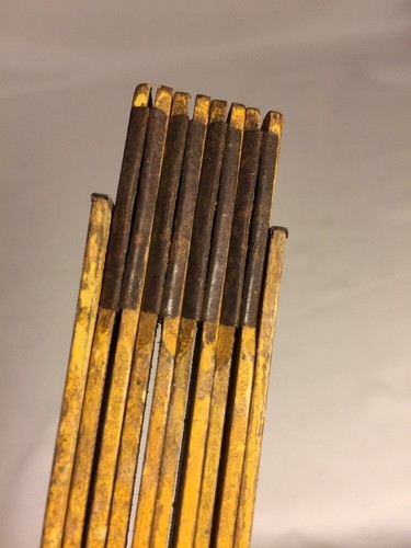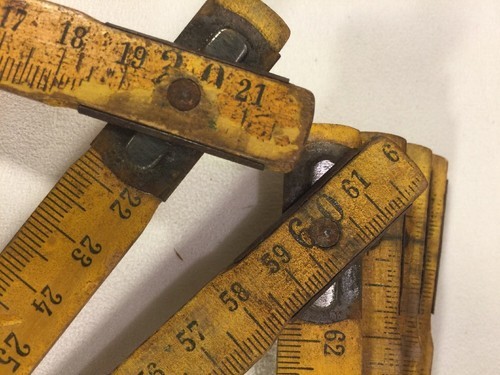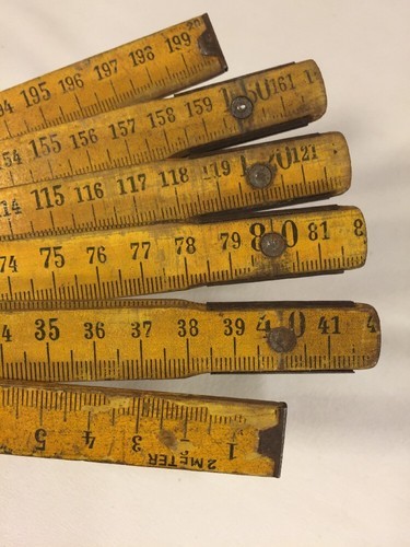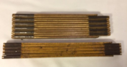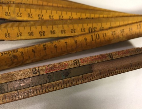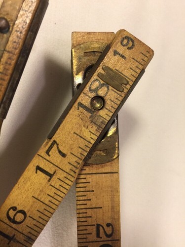 The days of really well made tools has passed us by, but still available. Back in the day when things were practical, and very useful, made to withstand time and all that, today is hard to find. Well your in luck, because this guy will do the trick. No need to have someone else hold the other end because it is flopping down, this guy will hold it's own. This one is standard units, showing inches to 1/16th. Is in great shape for age, and shows typical wear from usage. Still very easy to read, slider works great too. PLUS + also included is a vintage metric wood folding rule. This one is used alot more, so some markings are worn off. Is 2 meters long and shows down to the milimeters I believe (200).