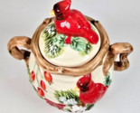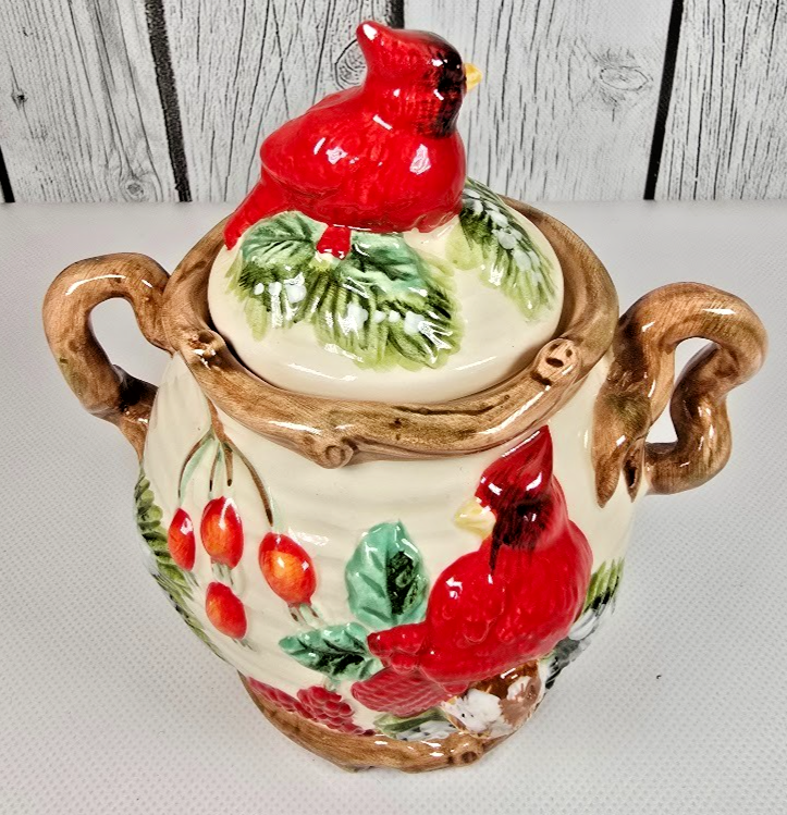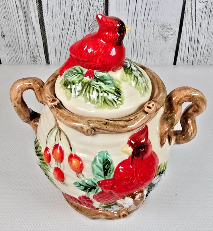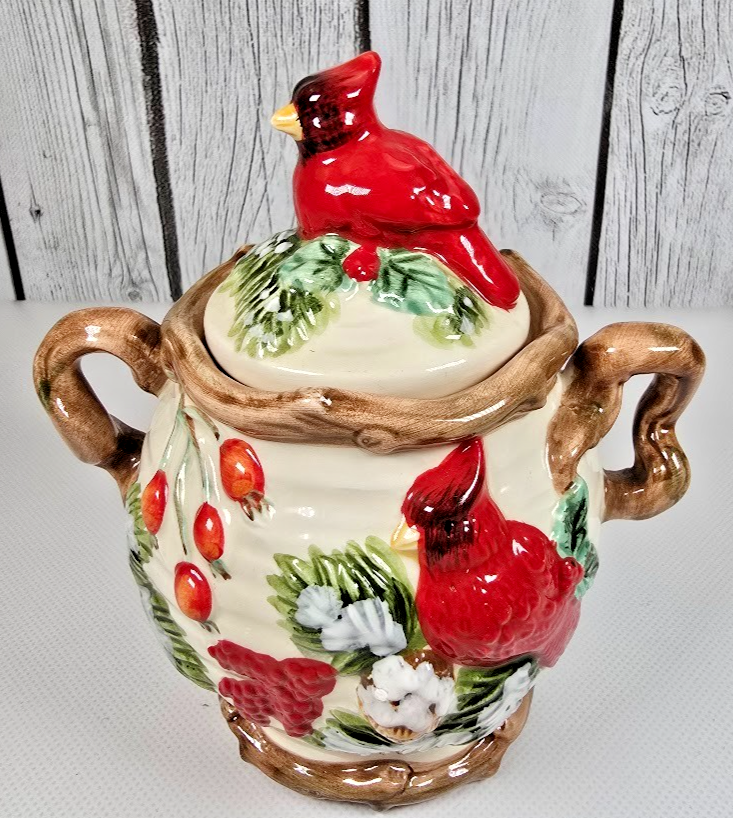- Old World Christmas Cardinal Evergreen Sugar Bowl Ceramic Pine Cone Holly Design