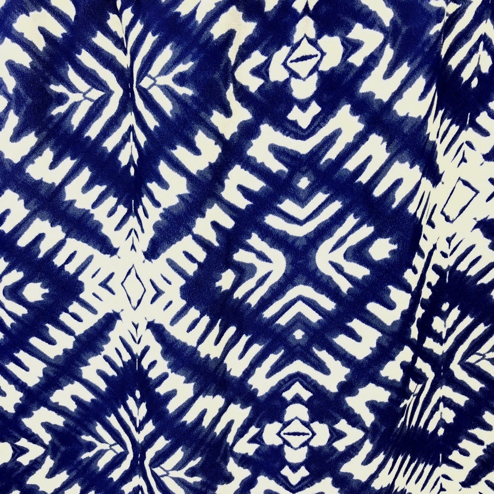 Women's Olivaceous blue and white boho top with tie front, three-quarter puff sleeves, elastic neckline and waistband, button on sleeve cuffs and button front.