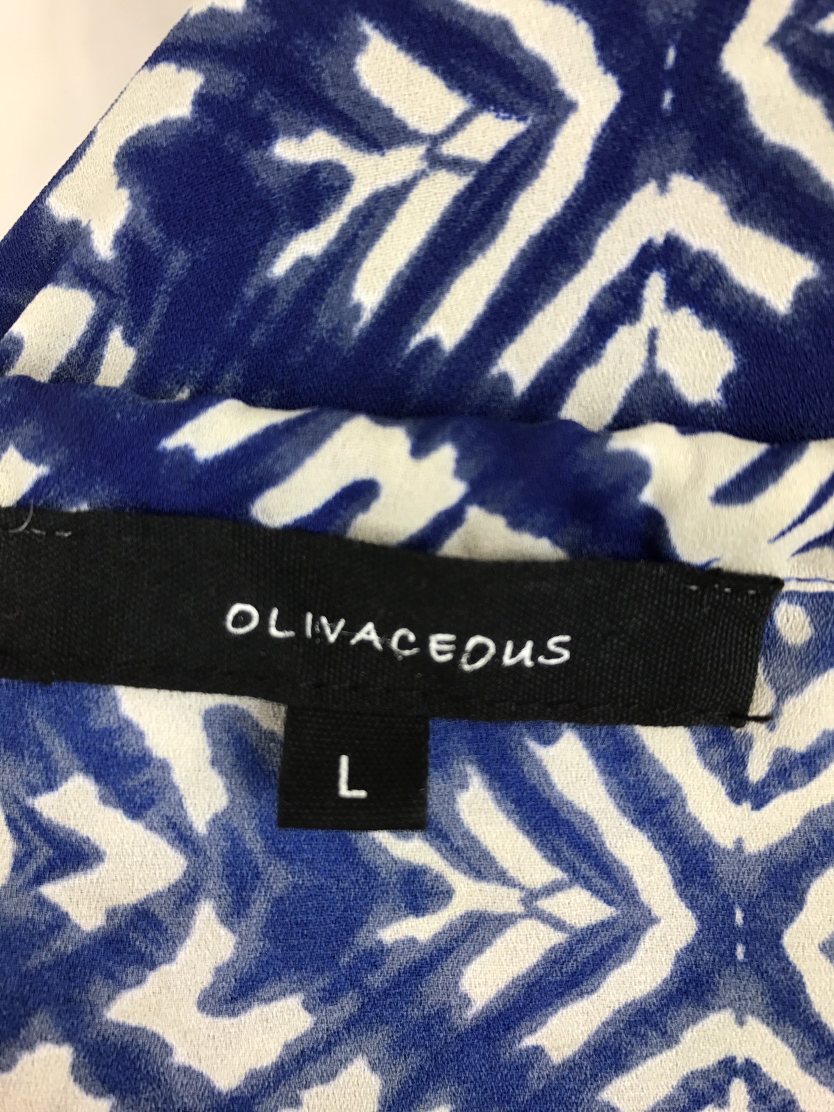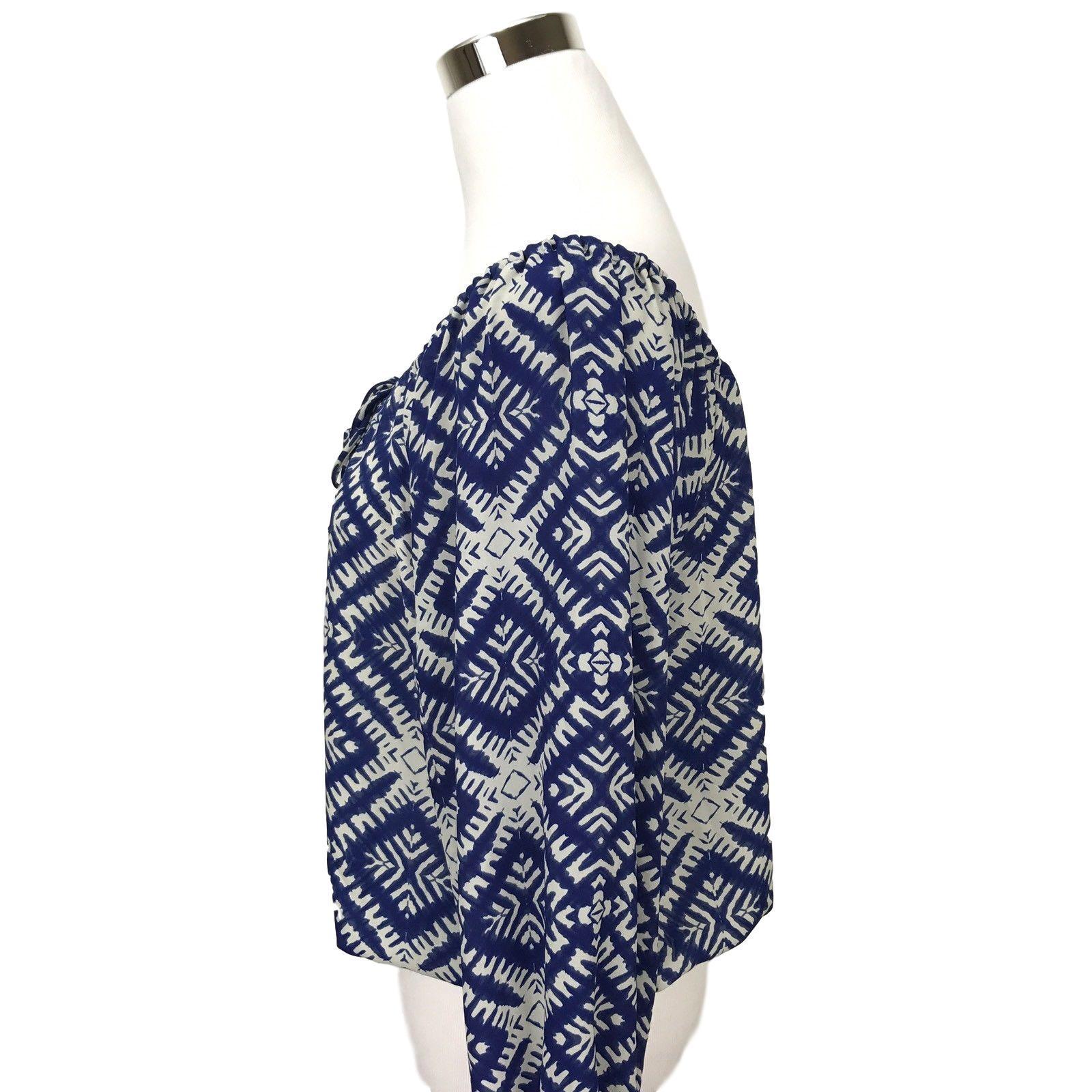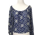 Olivaceous Top Peasant Blouse Womens Large Boho Blue White Tie Front Blouse