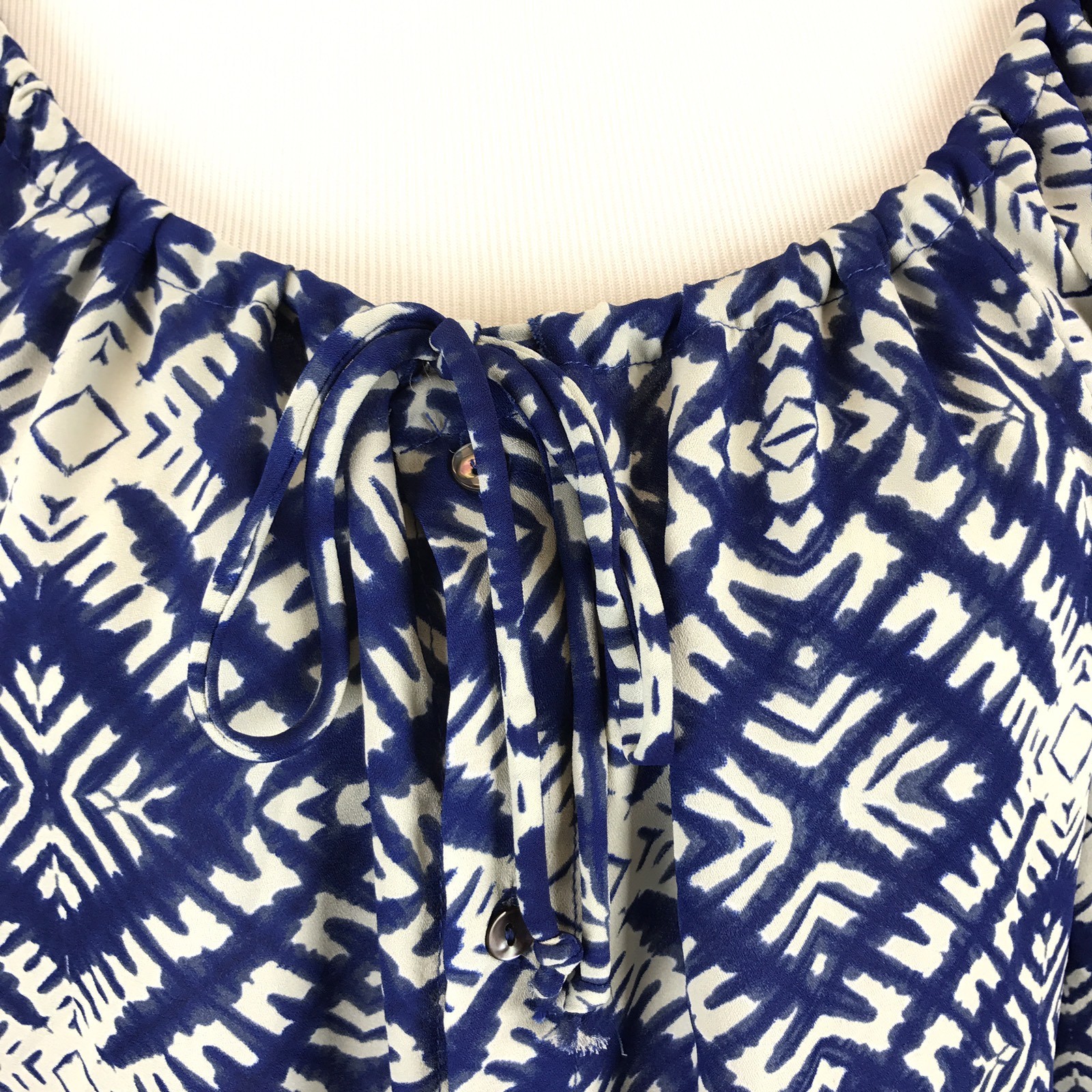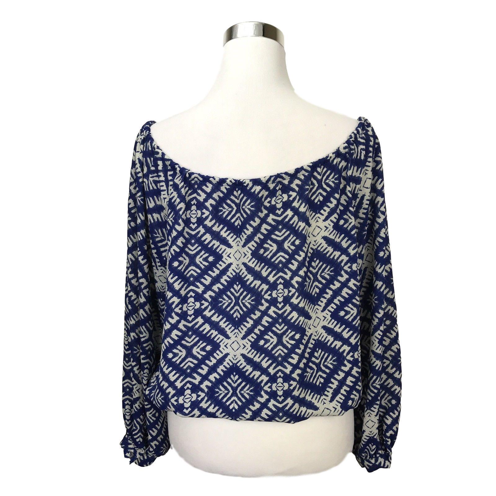 - Olivaceous Top Peasant Blouse Womens Large Boho Blue White Tie Front Blouse