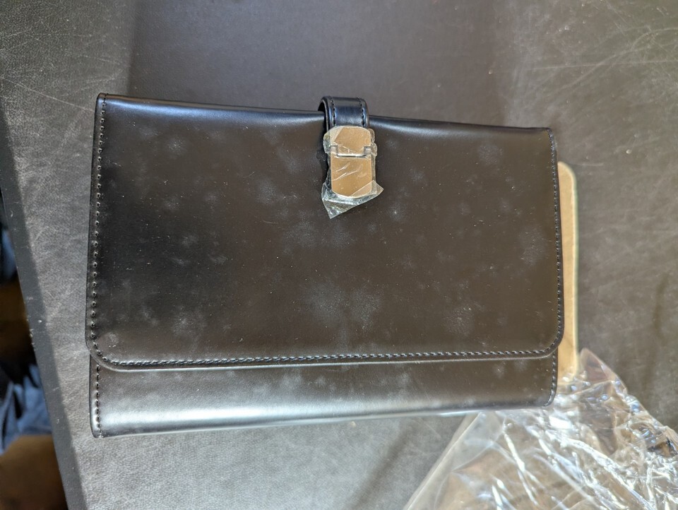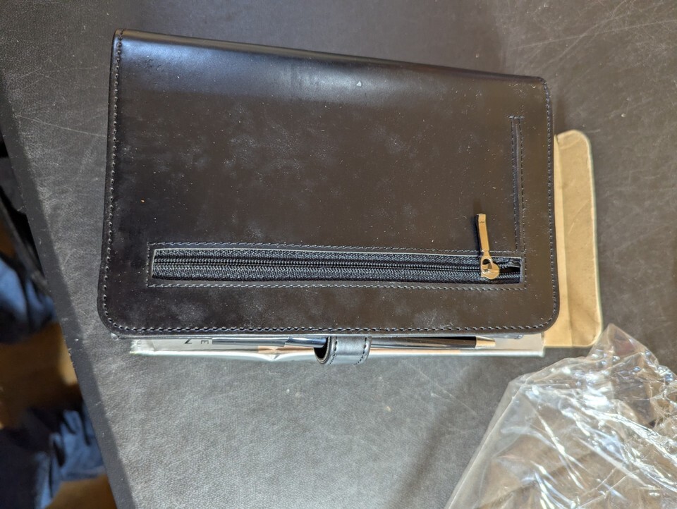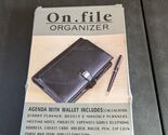 The On File Organizer Agenda with Wallet is a premium quality leather agenda with a sleek black color. It includes features such as a business card holder, flap closure, tear-resistant material, and a fastener for secure storage. Made in the United States, this organizer is perfect for keeping your meetings and daily notes organized in style. Ideal for professionals looking for a stylish and functional way to manage their schedules and contacts. Includes things such as phone number organizer and planners for daily, weekly and monthly events