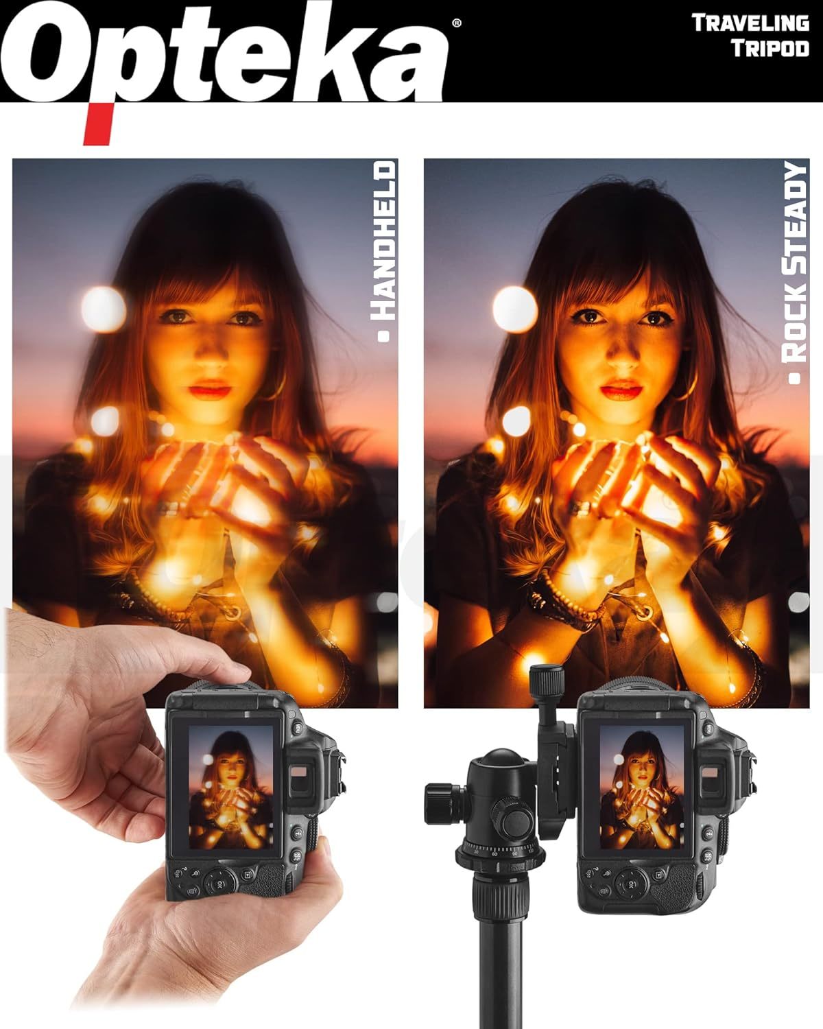 2-In-1 Tripod / Monopod Combo ? Our Opteka Traveler 2-in-1 can be used as a heavy duty ultra compact tripod or as a monopod (great for quick setup on rough terrain). Its maximum and minimum height of 16? to 59? as a tripod and 26" to 62" as a monopod allows you to get the exact shot you want, every time. Compatible Stable - This tripod/monopod combo works with DSLR, mirrorless, and video cameras including film, digital and video. Designed with a maximum load capacity of 22 pounds with a standard 1/4-inch universal thread, this 2-in-1 tripod / monopod accommodates a vast array of cameras while retaining camera stability. Heavy Duty, Built Tough - Constructed of an aluminum magnesium alloy which is highly durable and resistant to corrosion. Great for shooting outdoors in extreme weather conditions, hectic shoots, and heavy use. It also features a spring-loaded bag hook to hold gear and act as a counterweight in windy conditions. Ready Steady - The Opteka 2-in-1 Tripod / Monopod is the ideal traveling and outdoor companion, as it takes up very little space (15" folded with head attached) and yet gives invaluable support and yields far superior results than hand-held shooting for cleaner, more stable shots. It features a quick release system which allows for quick camera removal which is great on hectic shoots. Stable Shots Smooth Motion ? The removable metal ball head with quick release provides smooth and fluid 360-degree panning and features independent tilt and pan locks to secure your camera at any angle you desire (at any pan and tilt degree). Reversible Center Post - The center column can be inverted. This extremely versatile tripod / monopod features a 2-section central column, which allows you to mount your camera below the tripod for ground-level low-level macro shooting and for capturing intense ultra-wide-angle scenic landscapes with lots of foreground. Easy Set Up - It features a leg lock twist system for easy set up. Great for setting up fast and for hectic events. It also has a quick release plate with four rubber non-slip pads for added smoothness and stability. It also has 4 non-slip rubber end caps to protect indoor floors and surfaces. Lightweight Compact - Despite its strength and durability, it weighs just 3.08 lbs and folds to just 15? (with the head attached) for easy carrying and storage. Perfect for outdoor adventures like hiking or camping or family events like graduations, weddings, parties, sporting events like football, baseball, hockey, tennis, swimming, and other games and sports, or for any event where you quickly need a stabilized camera or camcorder. Perfect Horizons ? A glance at the ball head?s bubble level will allow you to quickly and easily get a perfect and straight shot on any terrain. Opteka stands tall as a leader of cutting-edge professional camera equipment. Covered by a 3-year warranty, trust a brand that has paved the way for quality and innovation for decades.