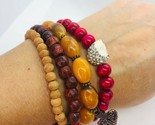 - Orange Red Brown Wood Bead 4 Stack Bracelet Set Copper Heart Rhinestone Skull