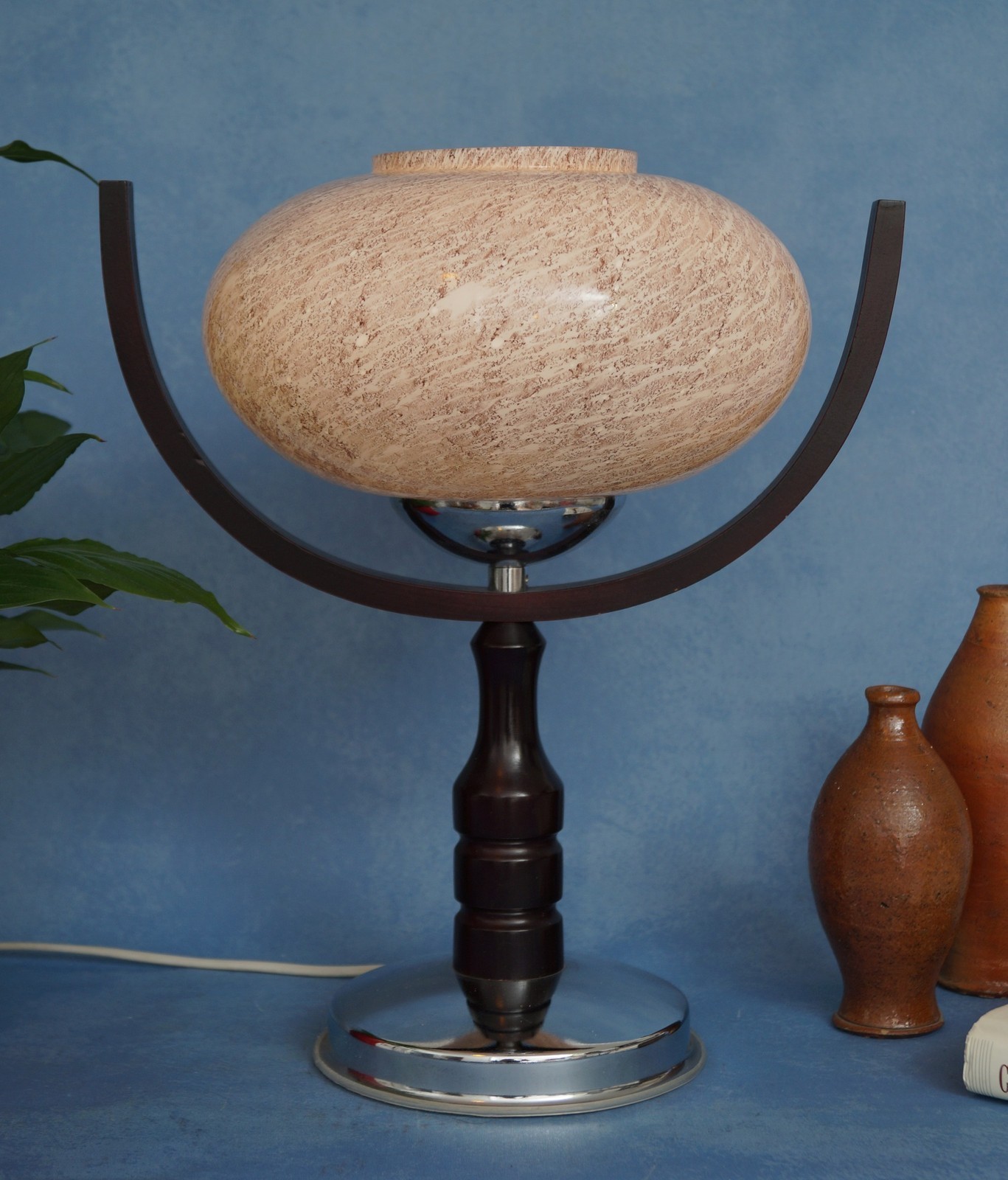 Lampe de table "Sputnik" originale des annees 1970 GDR - Pure East Alg. Bois d'origine (noir) et en acier inoxydable plaque en chrome. Opale d'opale d'origine! Hauteur totale d'env. 35 cm, diametre du parapluie 22 cm. Largeur totale 31 cm.