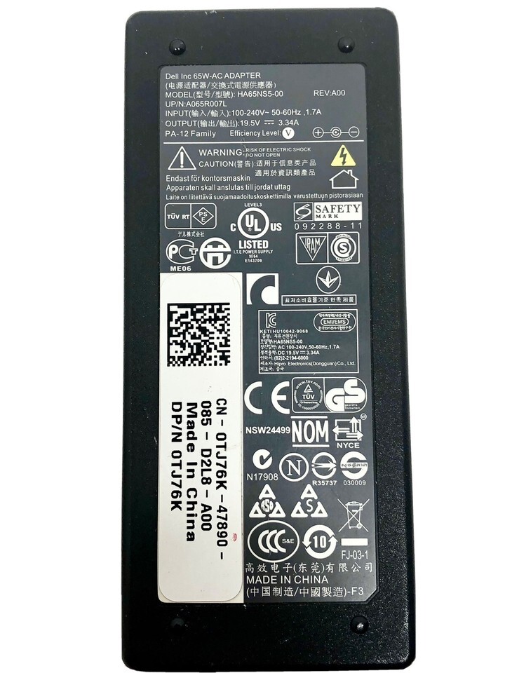 Original DELL HA65NS5-00 65W AC Charger Power Cord Adapter Laptop 19.5V Output Black.