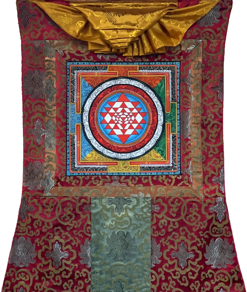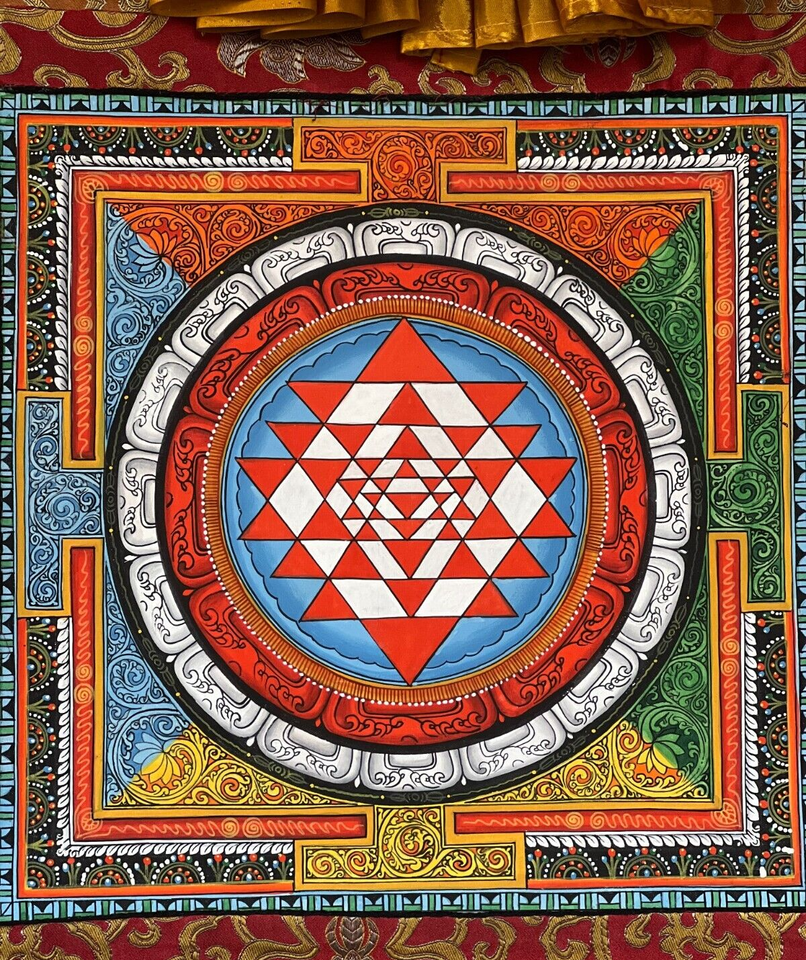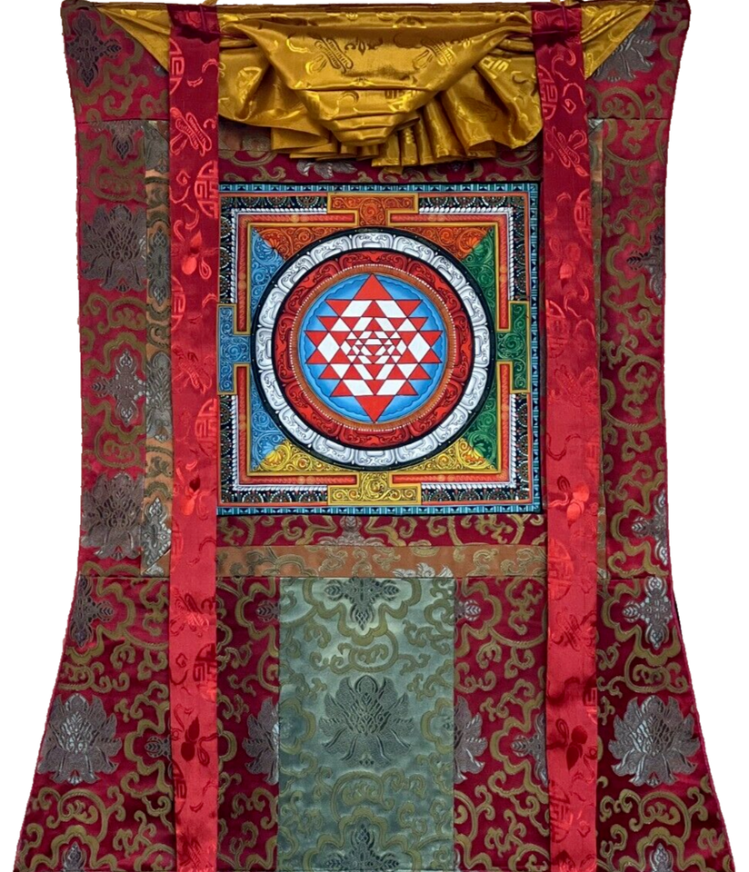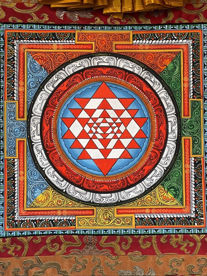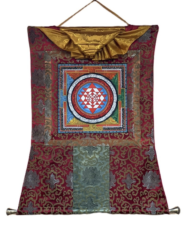 - ORIGINAL HAND-PAINTED SRIYANTRA MANDALA THANGKA/THANKA PAINTING WITH SILK BORDER