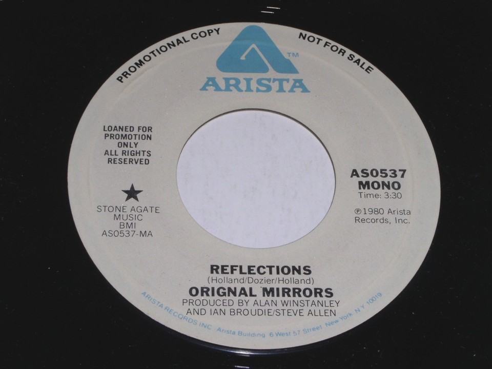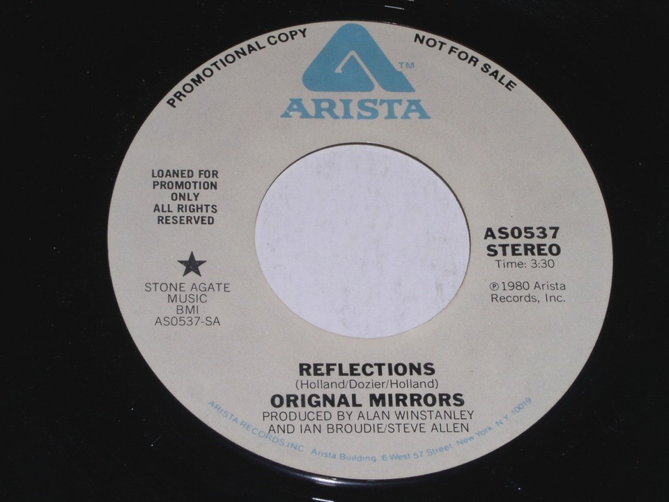 This is the original, vintage promotional 45 rpm by the band, Original Mirrors entitled, "Reflections". This is the mono/stereo issue. Record label Arista AS0537. *This has the name misspelled as shown in photo (both sides).