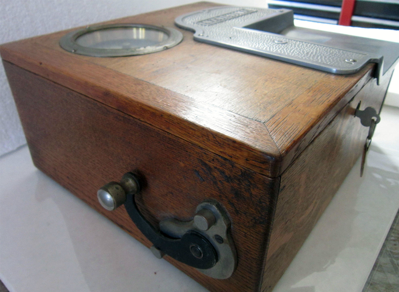 A Stafsine Cash Drawer, circa 1900's, manufactured in London, England. The cashier would write down each sale on a paper slip and the time could be noted by pressing on a lever on the right. The exterior case is constructed of solid quarter-sawn oak measuring 6" tall by 14" wide by 12" deep. The serial# noted inside the cabinet is #16997. The cash drawer has the original clock key and key for the cabinet. Quite an unusual cash drawer in exceptional condition
