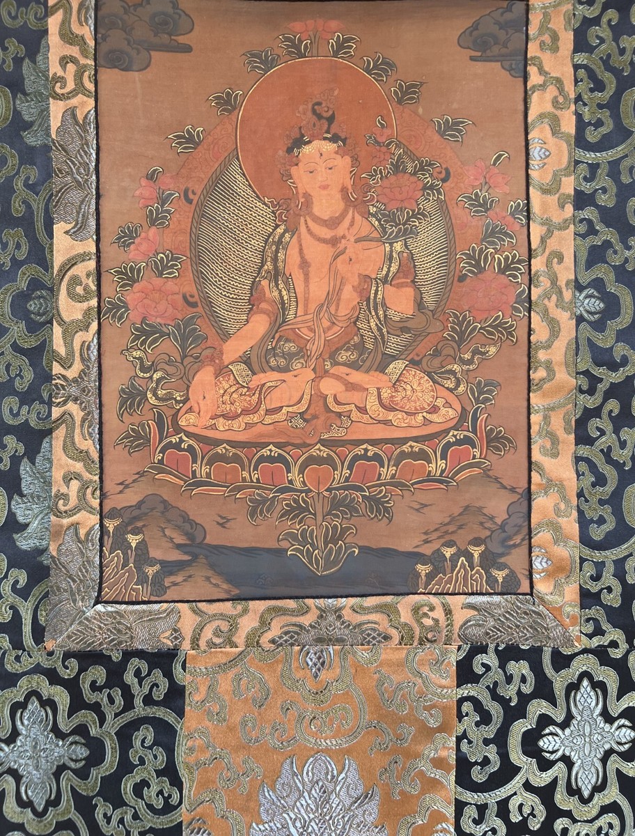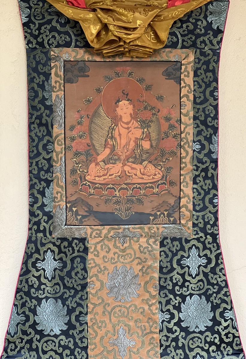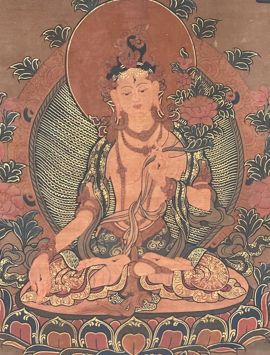 - ORIGINAL WHITE TARA OIL VARNISH OLD TIBETAN THANGKA PAINTING WITH SILK BROCADE