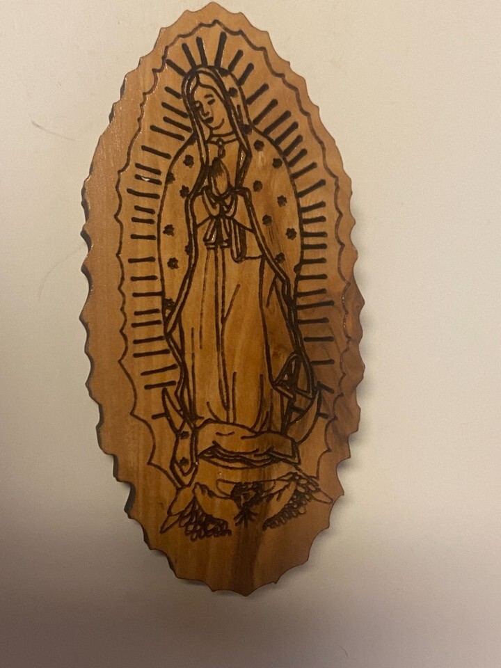 You are purchasing a beautiful olive wood magnet with an image of Our Lady of Guadalupe that was brought back from Bethlehem. The different coloring of the image is due to the beauty of the grain from the olive wood which has been kept intact to preserve it's originality.