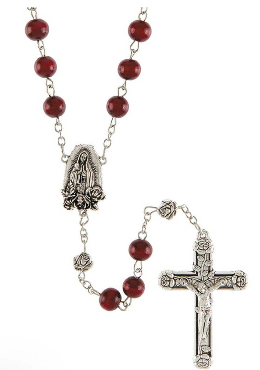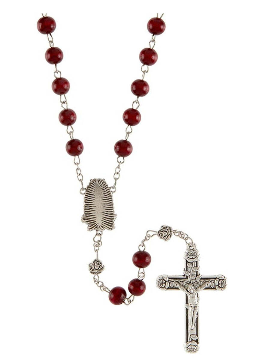 You are purchasing a beautiful a red wood bead rosary with the center medal of Our Lady of Guadalupe.