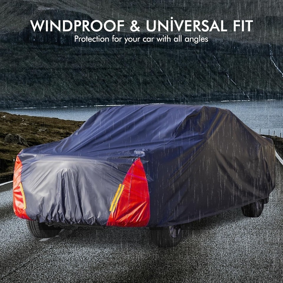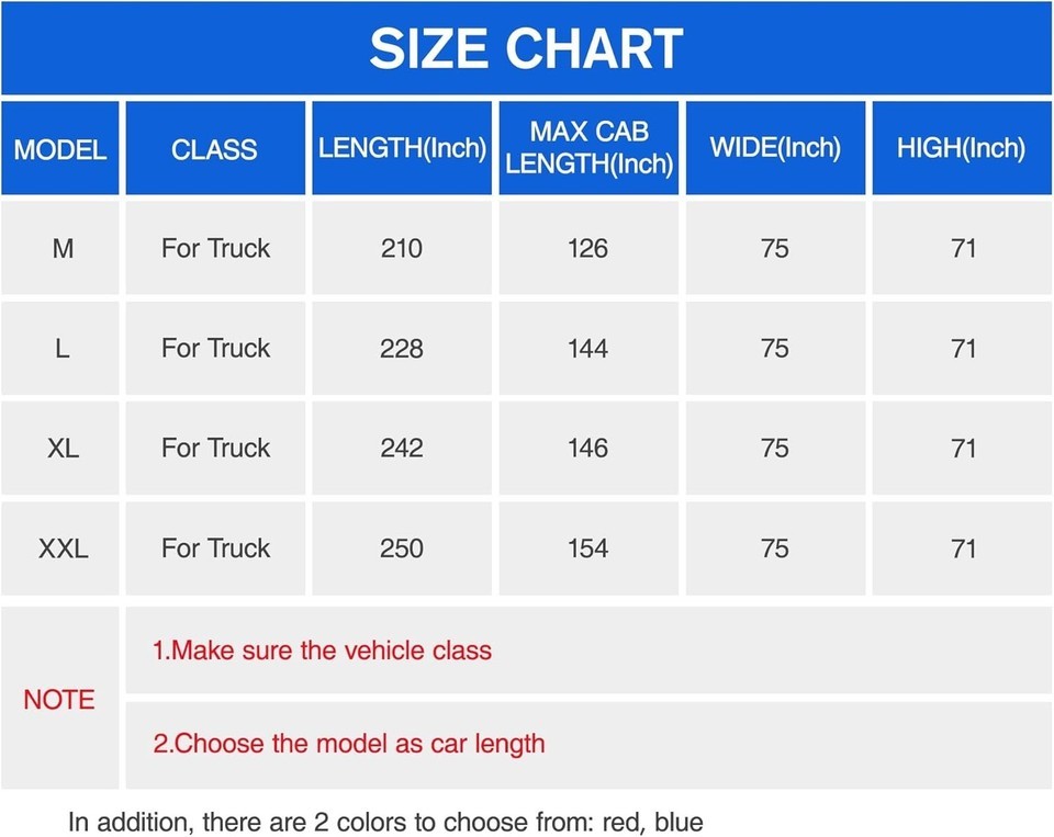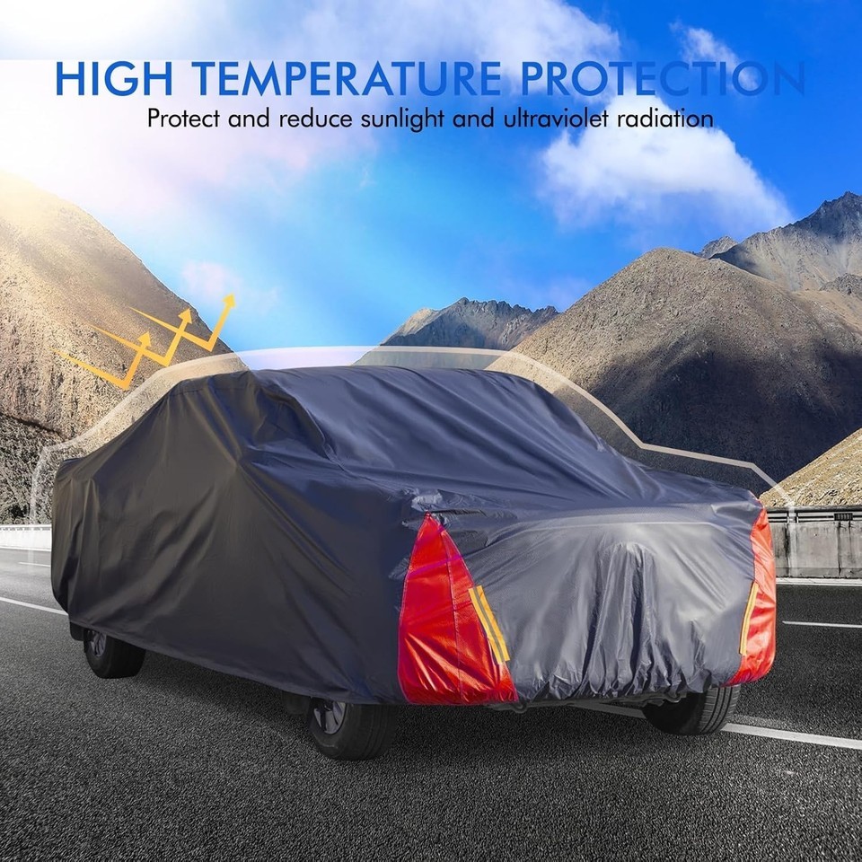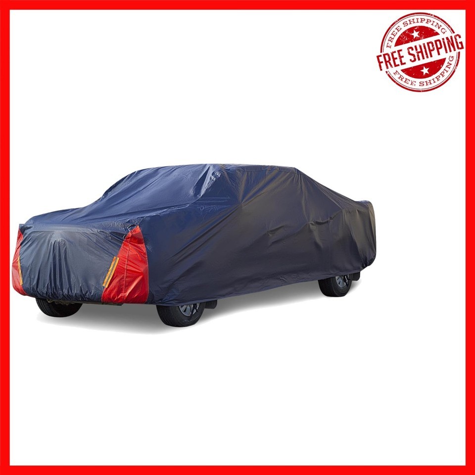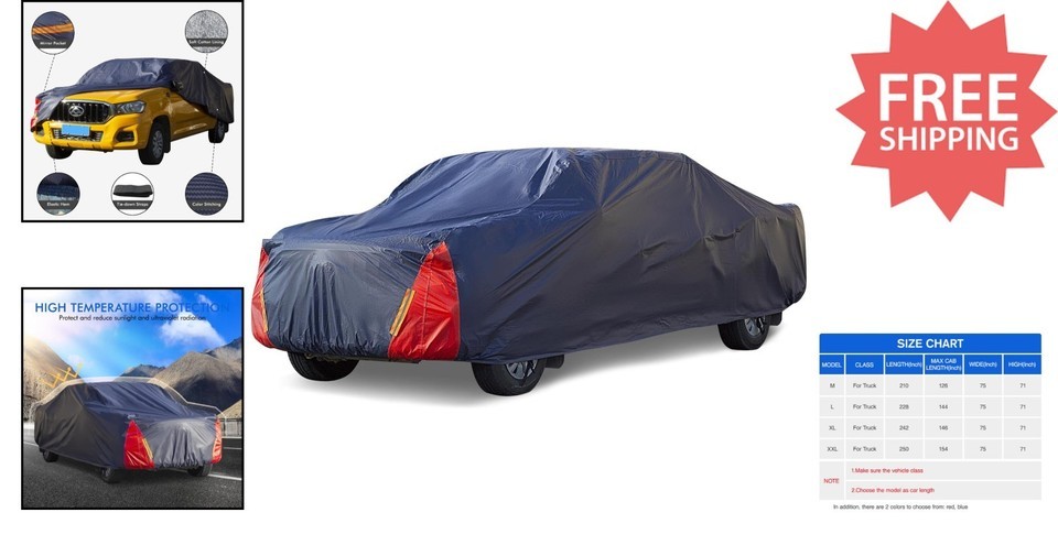Experience protection for your truck with our upgraded waterproof car cover, designed for vehicles up to 228 inches in length. Featuring a stylish two-color patchwork of navy blue with red or blue stitching, it adds a cool, modern look while safeguarding against wind, dust, sun, rain, snow, and hail. Crafted with a durable 6-layer construction, including reflective aluminum film and soft lining, this cover offers excellent UV protection and all-weather resilience. Easy to store in the supplied portable bag and equipped with a windproof rope and reflective strips for added safety, it?s perfect for -round use. Ensure the perfect fit by confirming your vehicle size before purchase. To ensure fast and reliable delivery, we work with multiple fulfillment partners and suppliers. Depending on availability and location, your order may ship from different warehouses or arrive in packaging that varies from item to item. Tracking details are typically provided shortly after shipment, and customer satisfaction remains our top priority. Please note that due to carrier policies and regional regulations, certain items may not be eligible for delivery to specific states or territories.