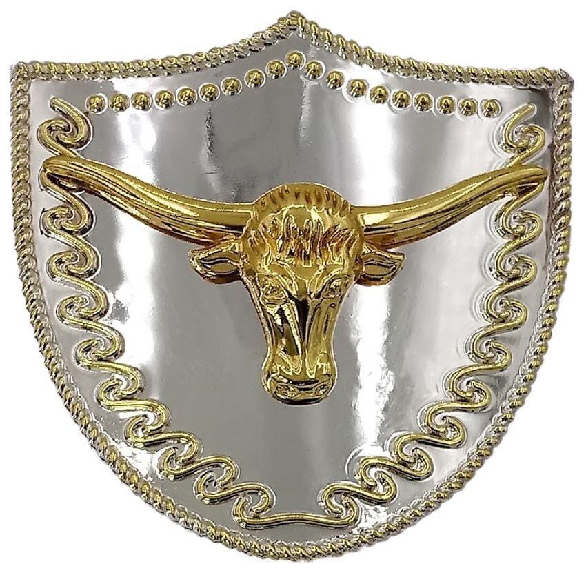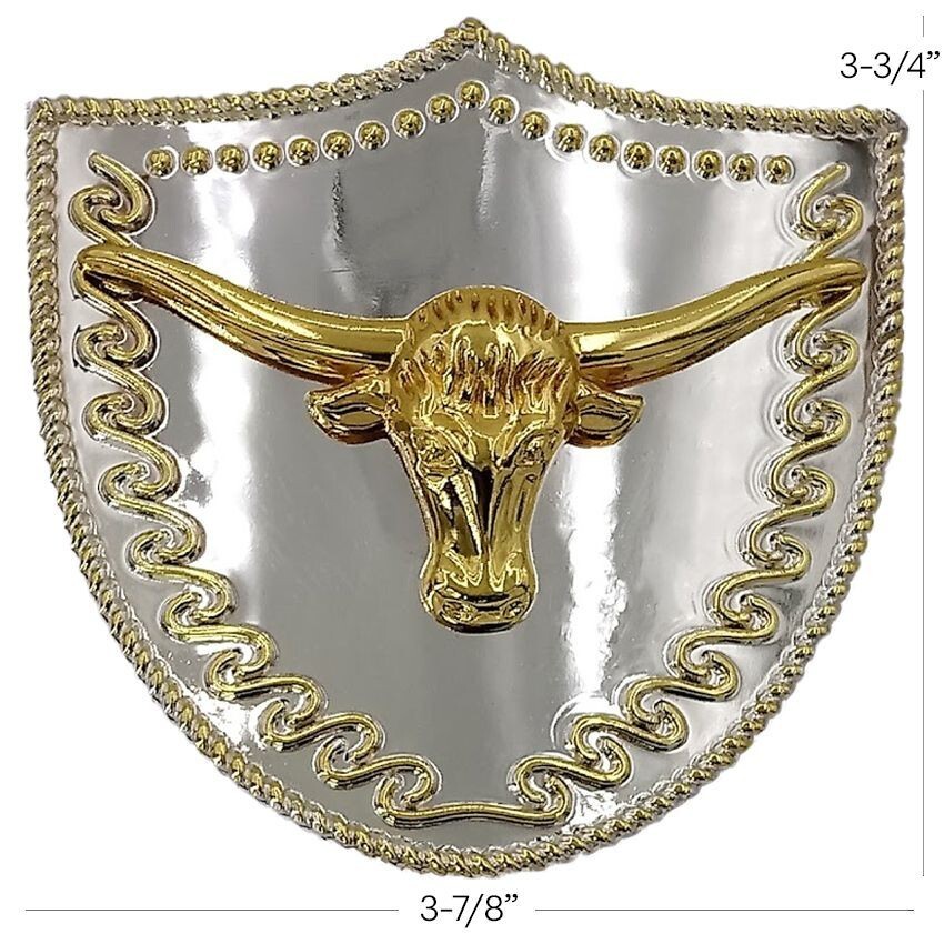This oversized belt buckle features a striking bull shield design in shiny silver metal. Perfect for men looking for a unique accessory to add to their vintage collection, the buckle boasts accents of a sturdy buckle that secures the belt in place. The metal material ensures durability, while the buckle's size makes it an eye-catching statement piece. Its color complements any outfit, making it a versatile addition to any wardrobe. The theme of the bull shield adds a touch of personality to any outfit, and the buckle is suitable for any occasion. Fits 1-1/2 inches belts.